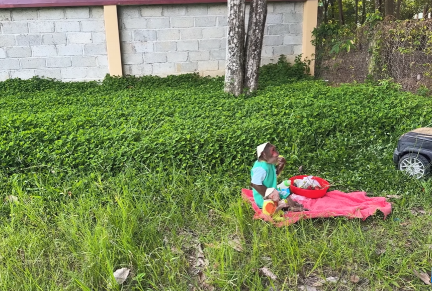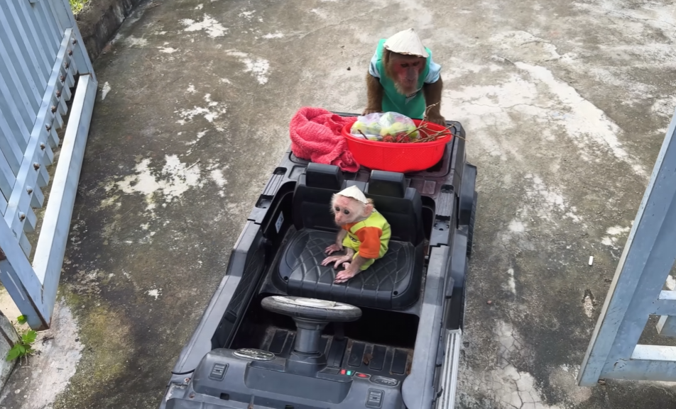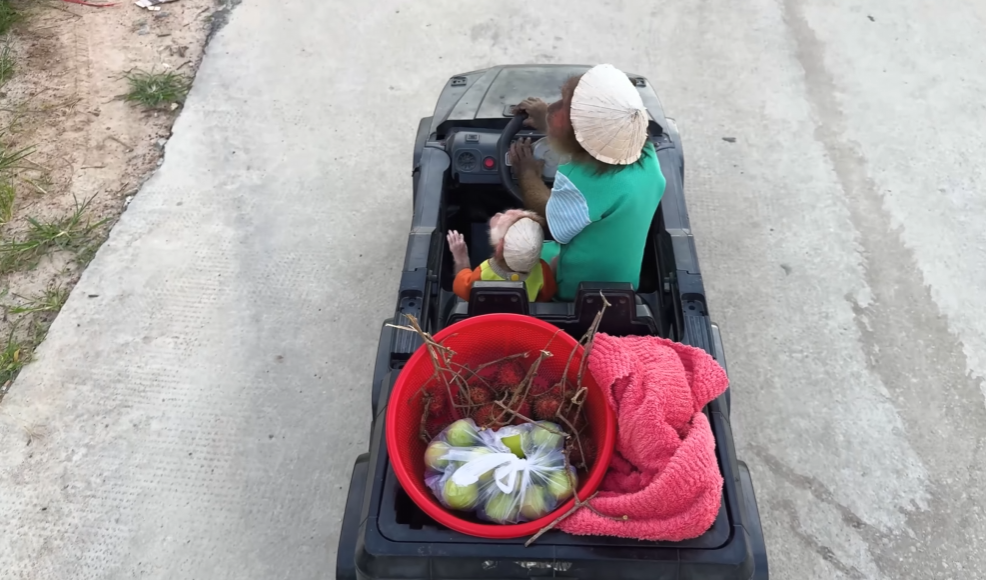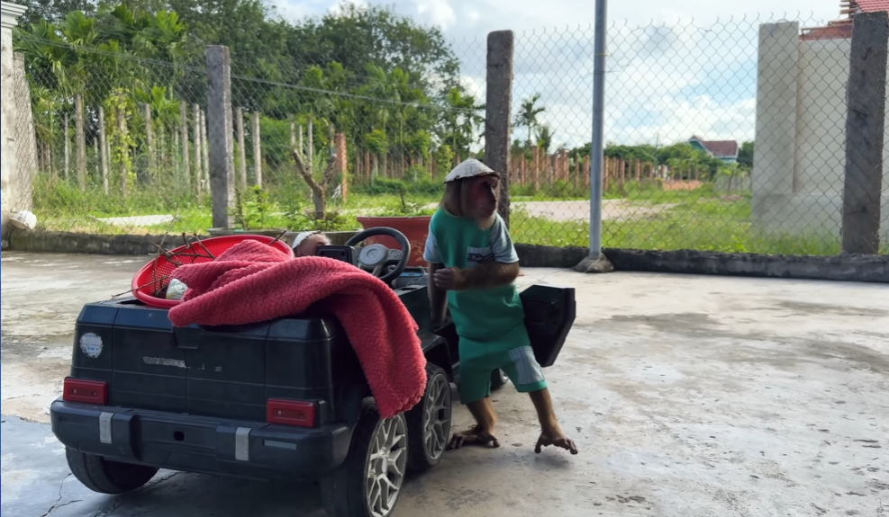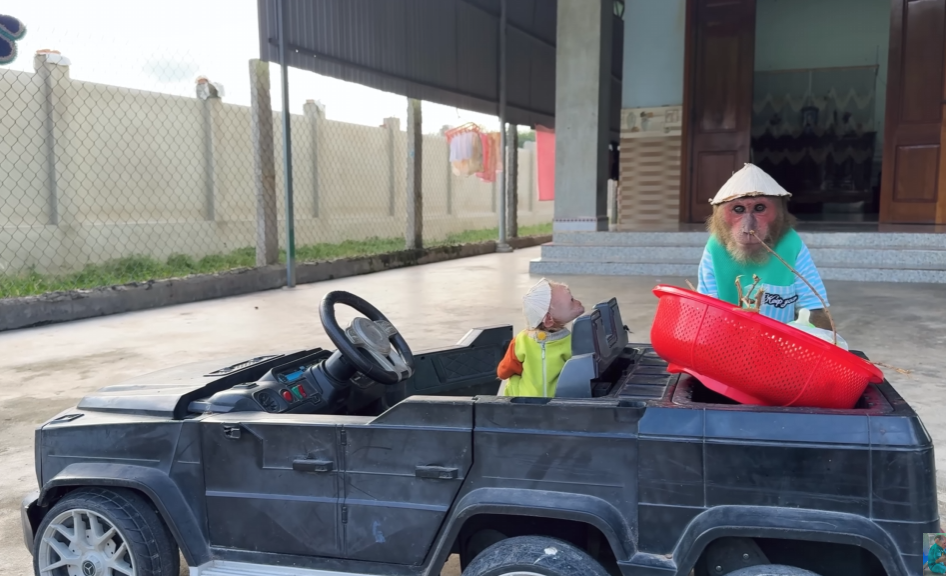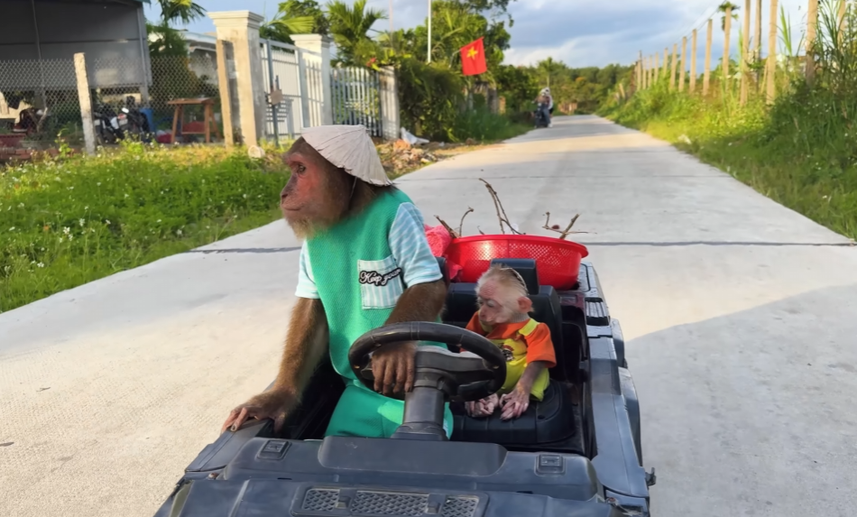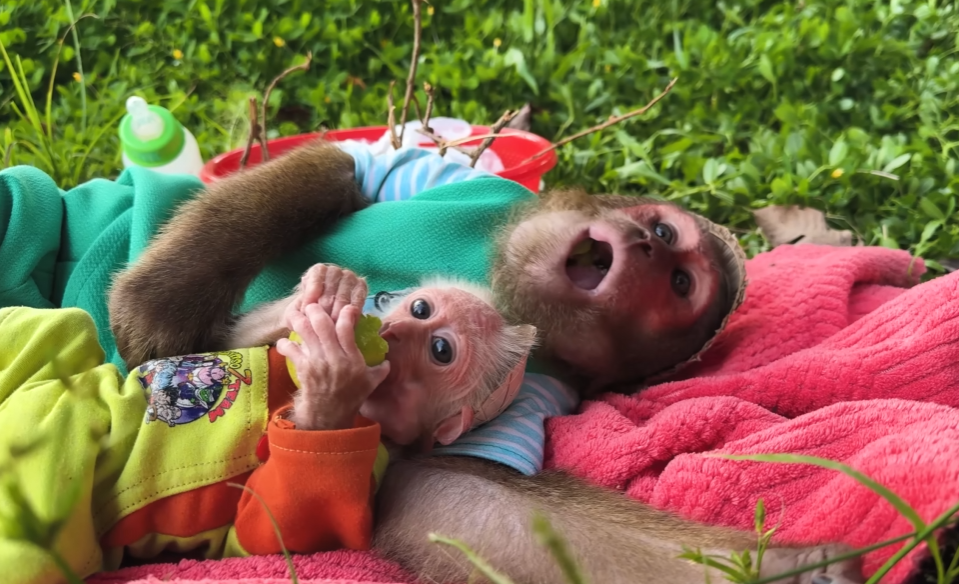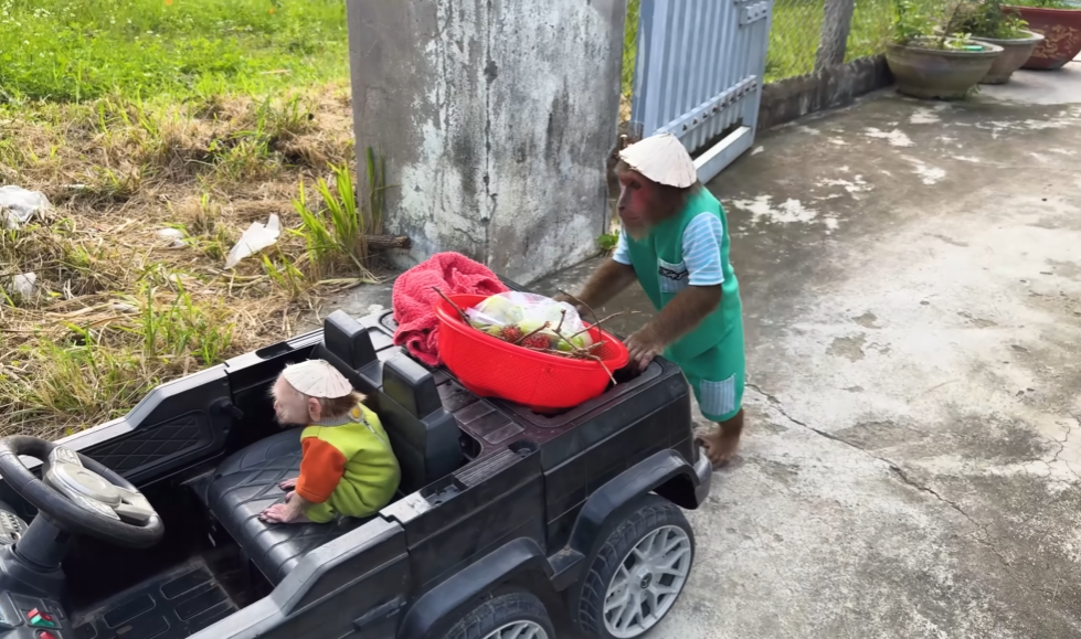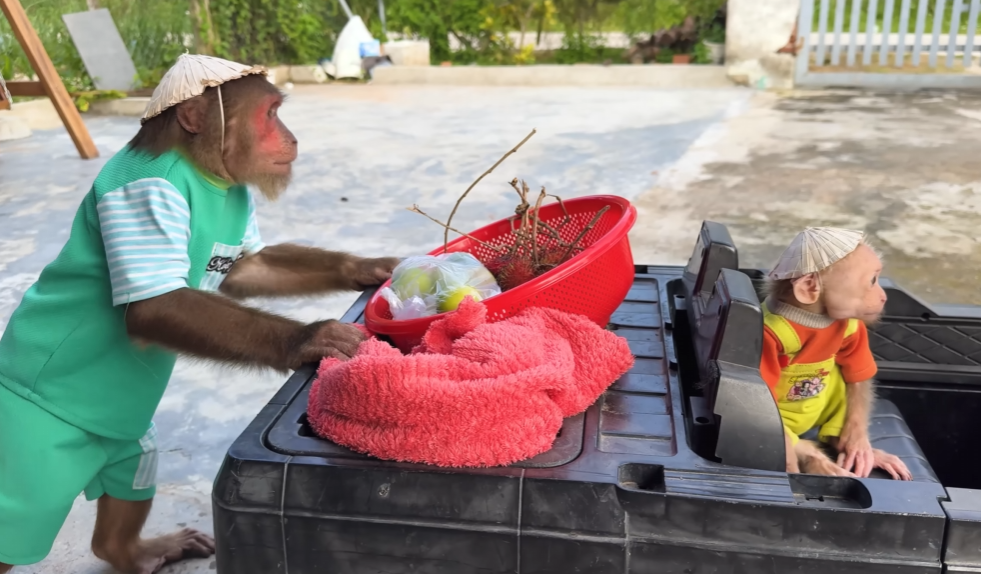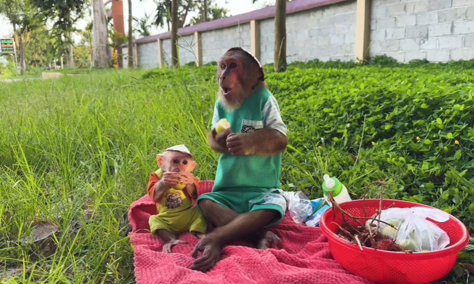 Whenever flies or insects buzzed near Lina, the monkey would swipe at them with quick, playful hands, while CUTIS wagged his tail softly to fan the air and keep her cool. Sometimes, when Lina cried, CUTIS would nuzzle her gently, and the monkey would bring little flowers or leaves, trying to cheer her up.
