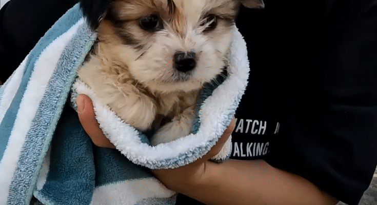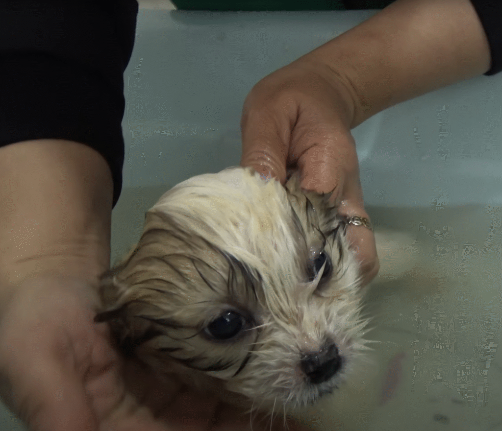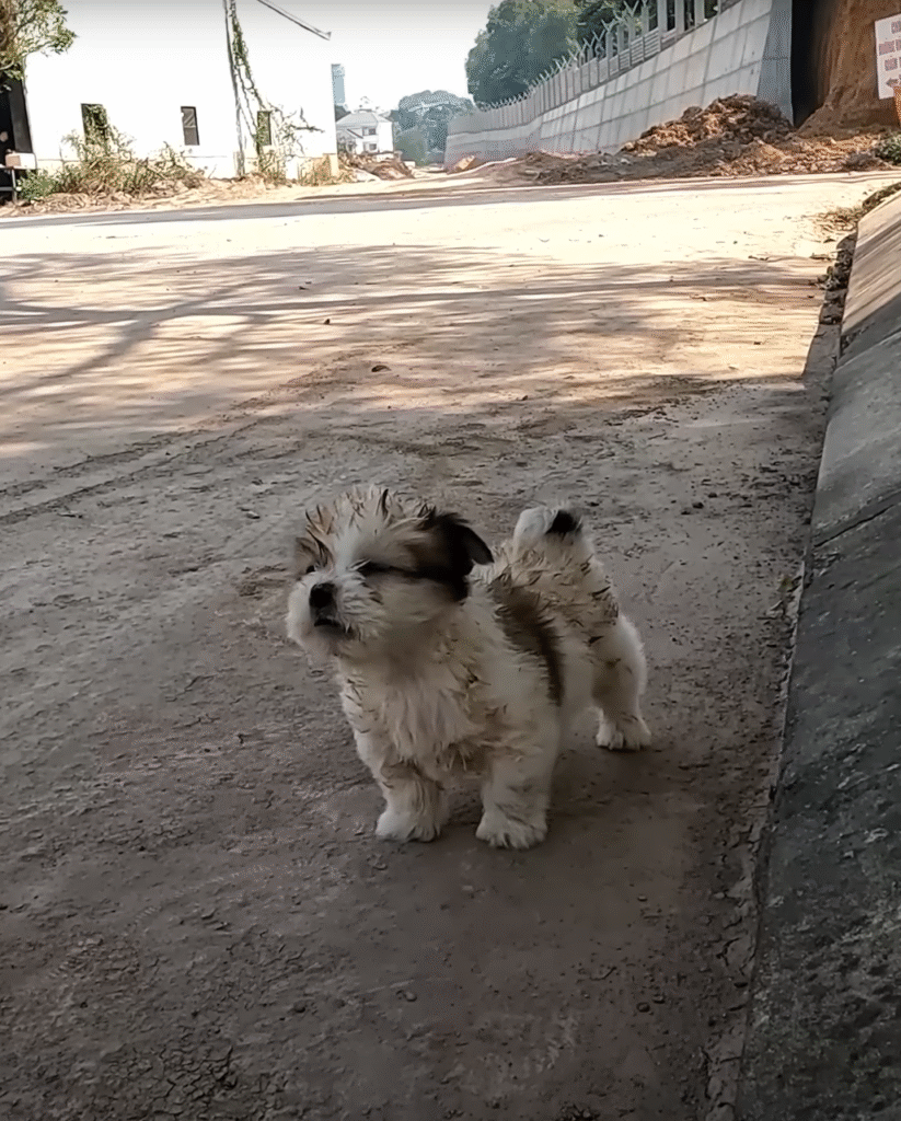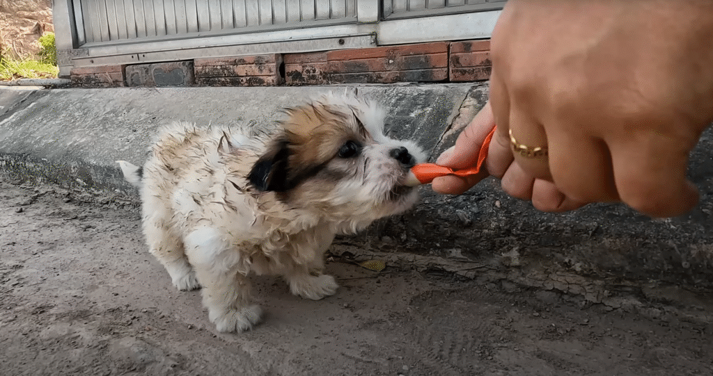 There he was — a tiny puppy, no more than two or three months old, digging desperately at the garbage. His little body trembled as he tried to pull scraps of leftover bread from a torn plastic bag. He was so thin that his ribs showed clearly through his dull, matted fur. His eyes, wide and sunken, reflected both fear and hope. He was starving.