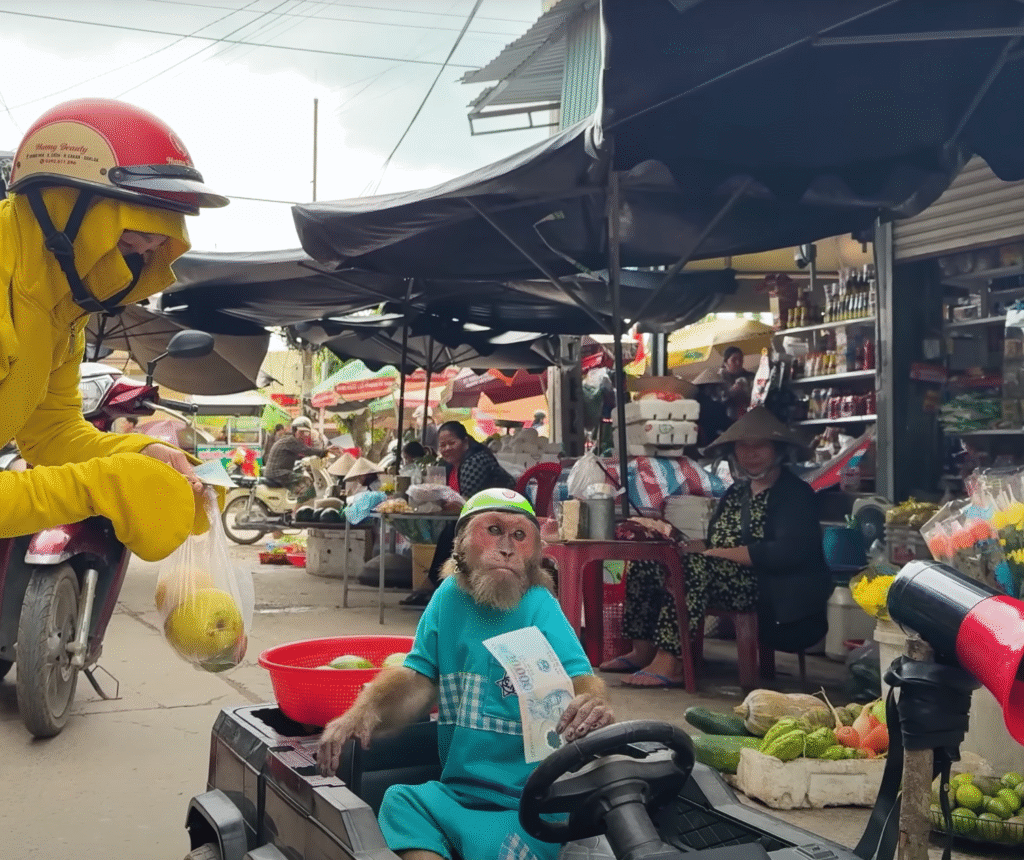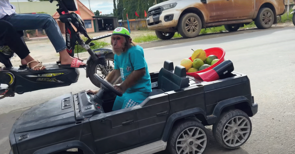 He climbed onto a wooden crate, the baby monkey beside him, and began waving the scarf dramatically. Curious villagers gathered around, laughing at the sight of two monkeys acting like merchants.