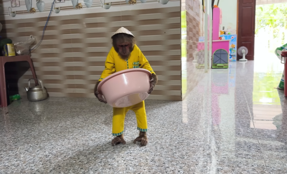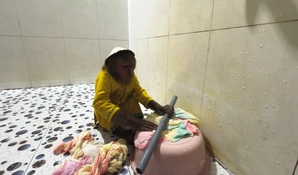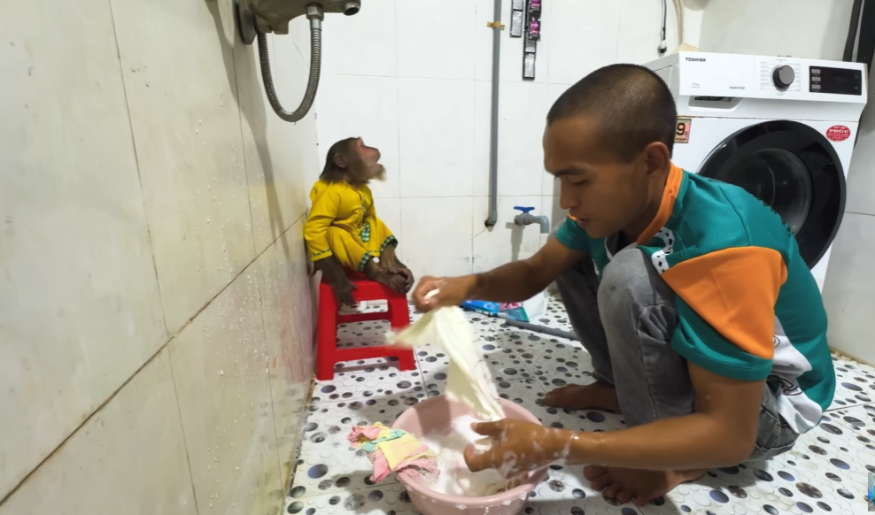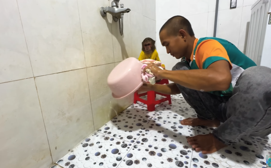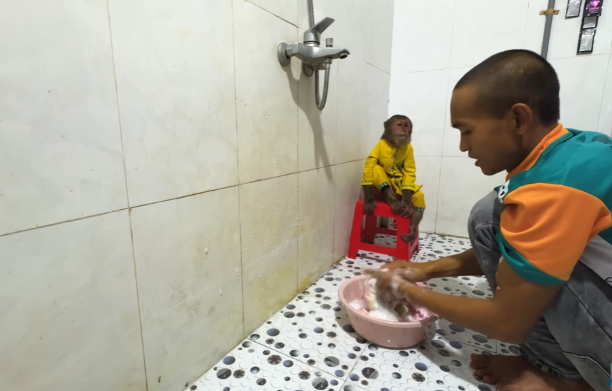 The monkey, eager not to be left out, grabbed a sponge and tried to copy Dad. But instead of helping, it squeezed the sponge so hard that water splashed everywhere—on the walls, on CUTIS, even on Dad’s shirt! CUTIS squealed with laughter while the baby kicked happily in the water.