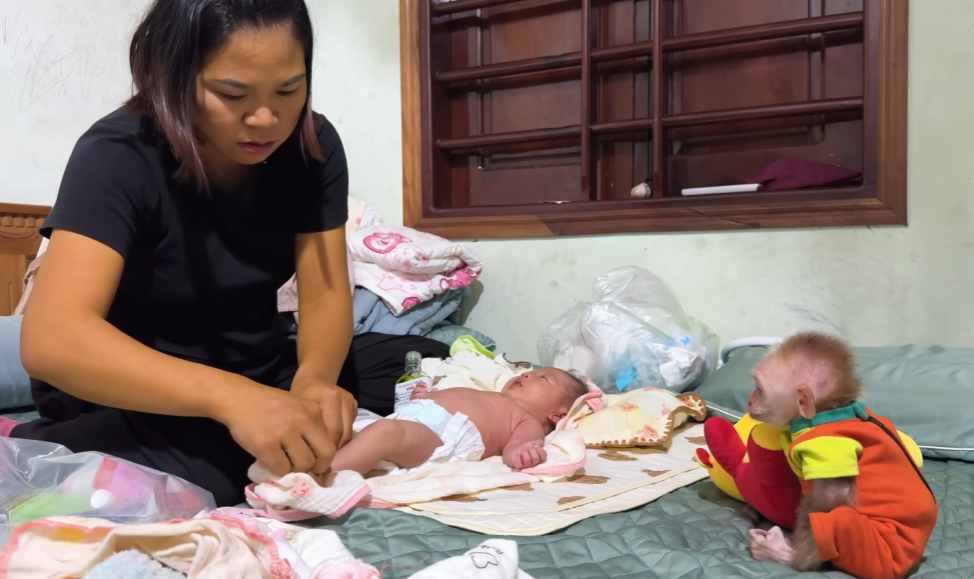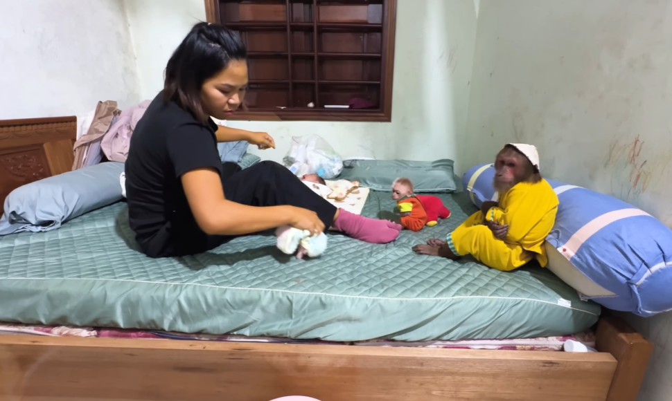 The baby monkey, however, was even more curious. From the first moment, it peeked into the crib, tilting its head as if trying to figure out what this tiny creature was. At first, Dad worried the monkey might be too rough or jealous. But instead, something magical happened: the monkey seemed to understand the baby’s fragility. It tiptoed around the crib, gently patting the baby’s blanket as if to say, “I’ll help take care of this one too.”
