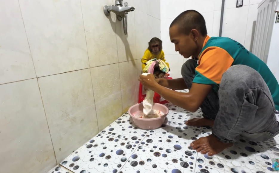 Bath time was another adventure. Dad carefully placed the baby in a small basin, gently pouring warm water over its skin. CUTIS stood close, handing Dad the towel and baby soap like a little assistant.
