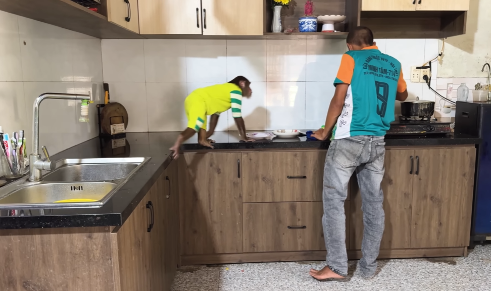 The monkey, however, couldn’t resist trying to join in. One day, as Dad handed CUTIS the bottle, the monkey darted forward, snatched a banana from the fruit bowl, and proudly placed it near the baby’s mouth—as if saying, “Here, this is food too!”