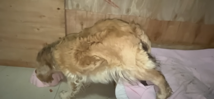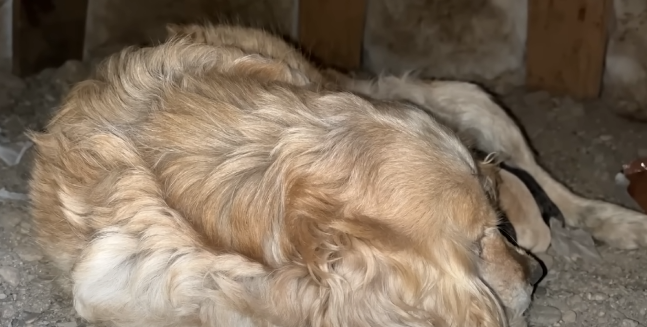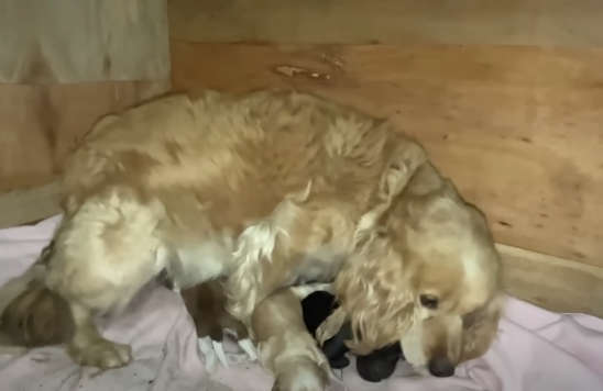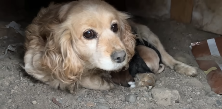 There, under a piece of torn plastic sheet, was a Cocker Spaniel mother, her golden fur matted and dirty, her eyes dull with exhaustion. Curled tightly beside her were five tiny puppies, barely a few weeks old. They were trembling, their small bodies pressed against their mother for warmth.