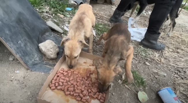 We placed a small bowl of water and some food near her. At first, she just stared, unsure if it was safe. Then hunger and exhaustion took over. She lowered her head and began to eat — slowly, cautiously. Her puppies squeaked softly, nudging her belly.