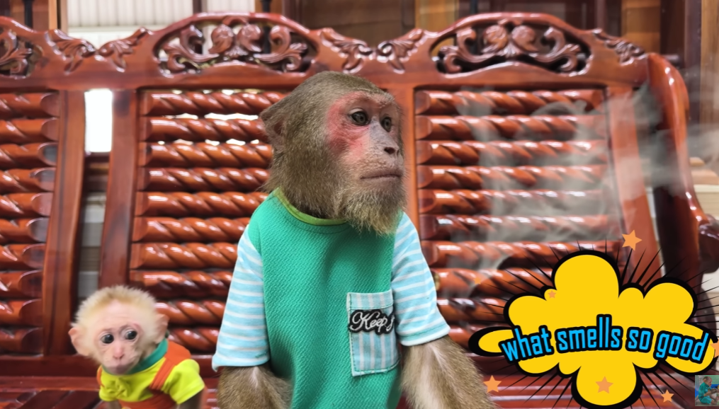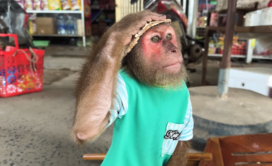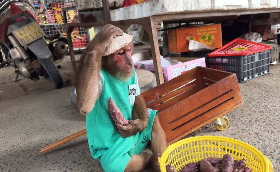 Everyone walking by stopped out of curiosity. What kind of market could a man and a monkey run together? But as soon as people got closer, they couldn’t help smiling. The baskets of fruits and vegetables were neatly arranged — bananas, mangoes, cucumbers, and sweet corn — and right in the middle sat little Milo, wearing a tiny straw hat, holding a small fan made of palm leaves.