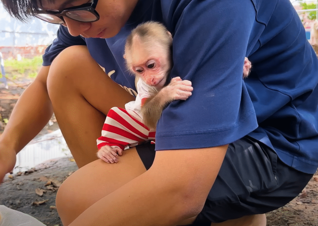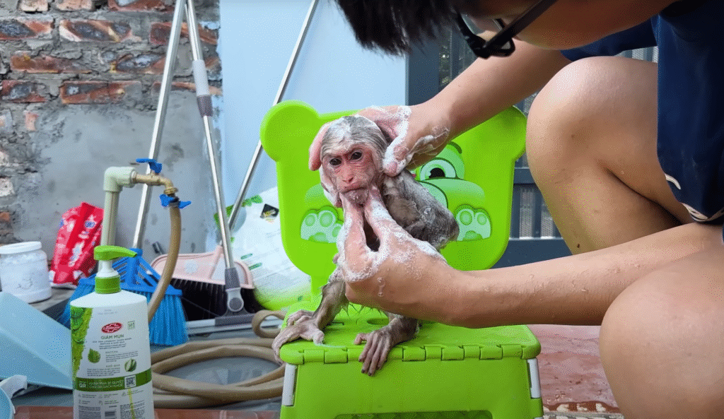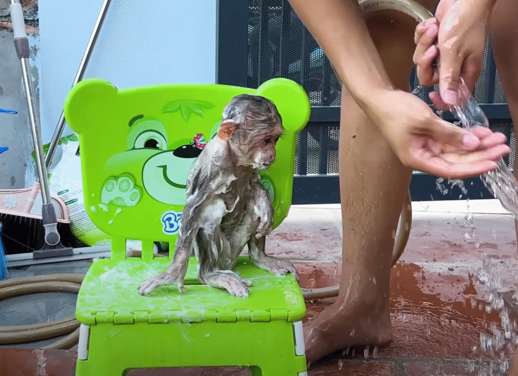 She washed the mud off Lala while the little monkey sulked quietly. But as soon as she was clean, Lala’s mischievous grin returned. “No more chicken chasing, okay?” Grandma warned, wagging her finger.
