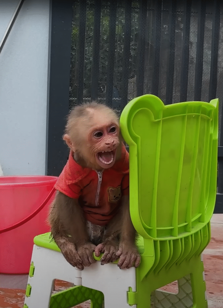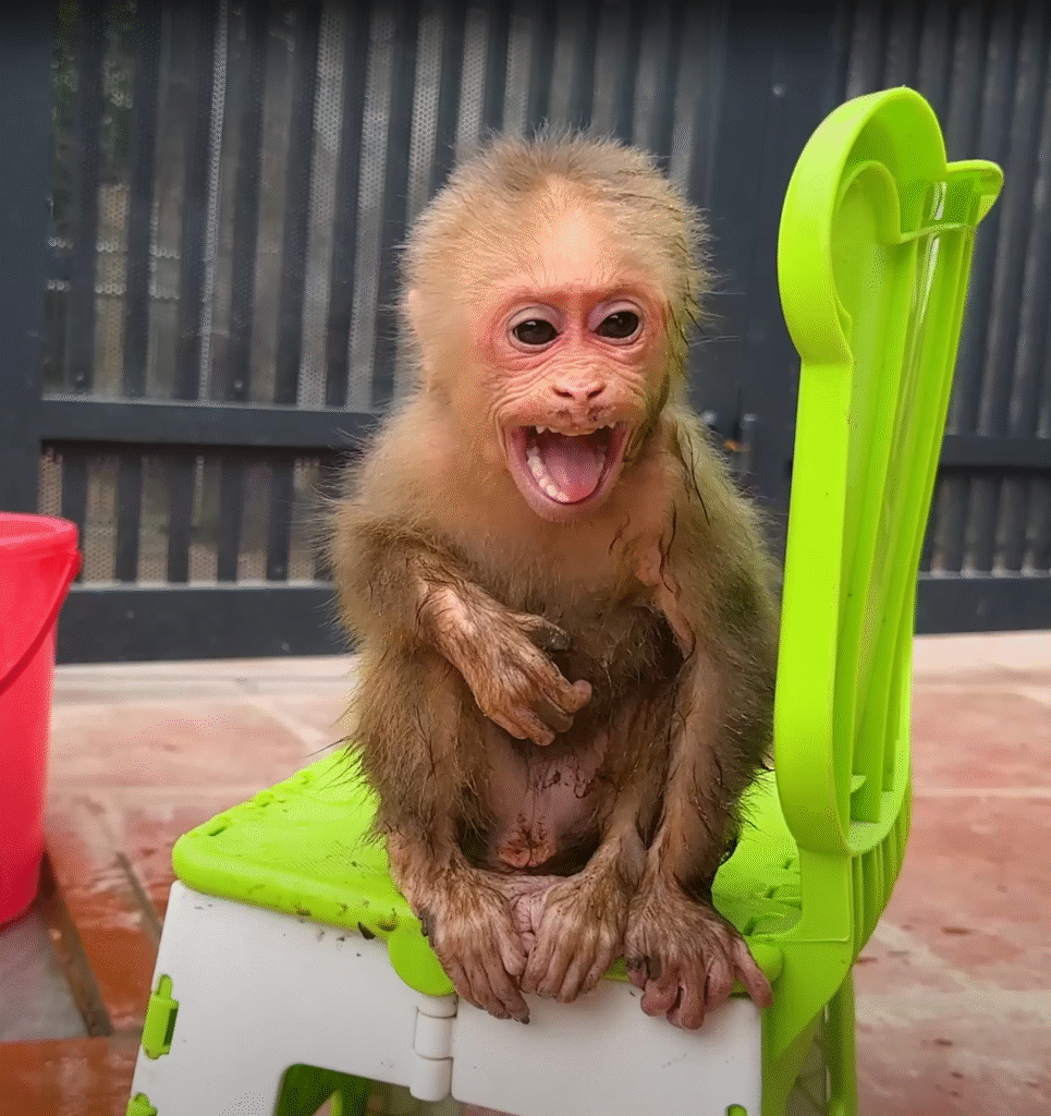 Then she noticed her reflection in the water. Her fur was sticking up in funny directions, and her face was covered in little water droplets that looked like jewels. She made a silly face at herself — sticking out her tongue, puffing her cheeks, crossing her eyes. She burst into laughter. “Haha! Funny monkey!”