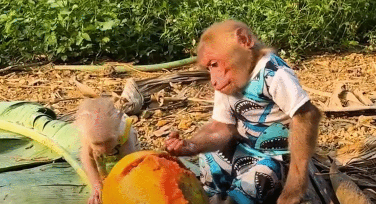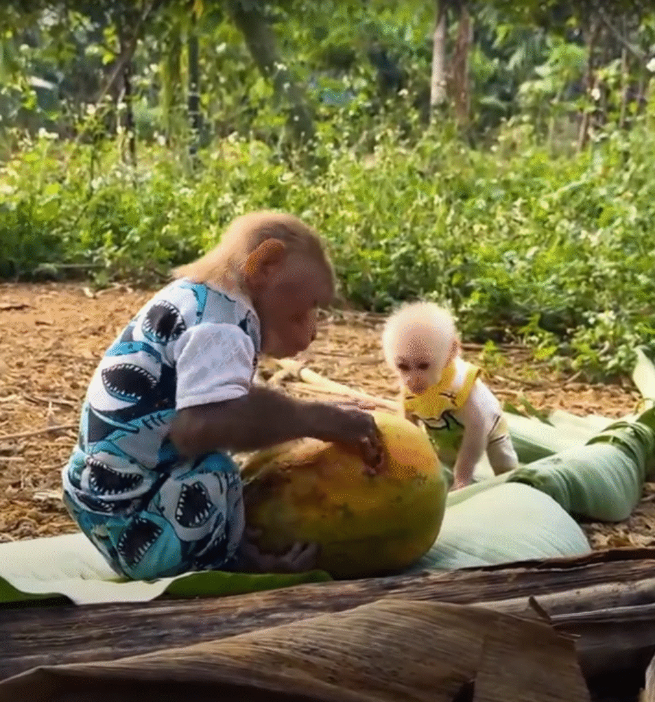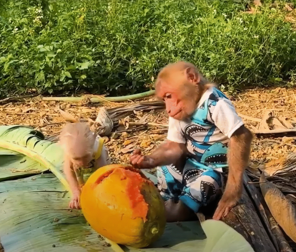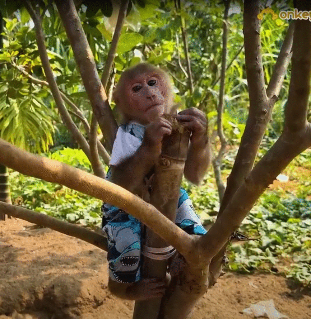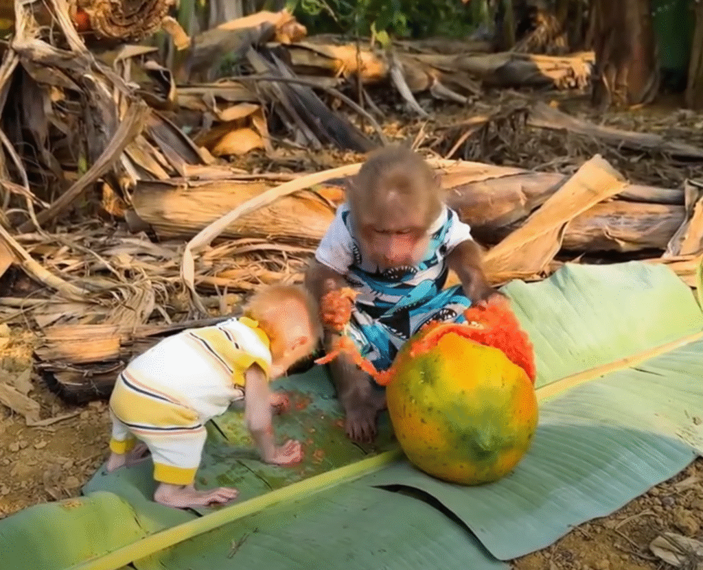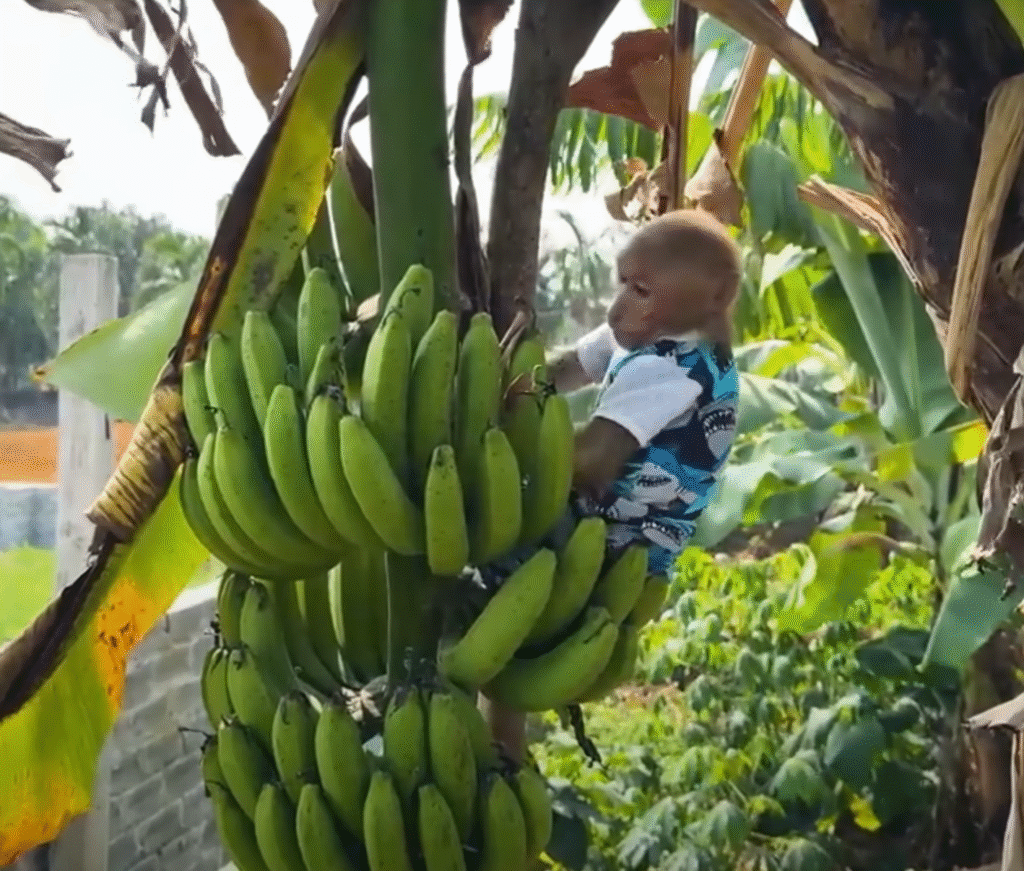 They continued playing, laughter echoing through the trees. When they got tired, Bibi found a shady spot under a mango tree and shared his snacks — a few sweet bananas and a handful of peanuts. Lala munched happily, sitting right beside him, her small head resting against his shoulder.