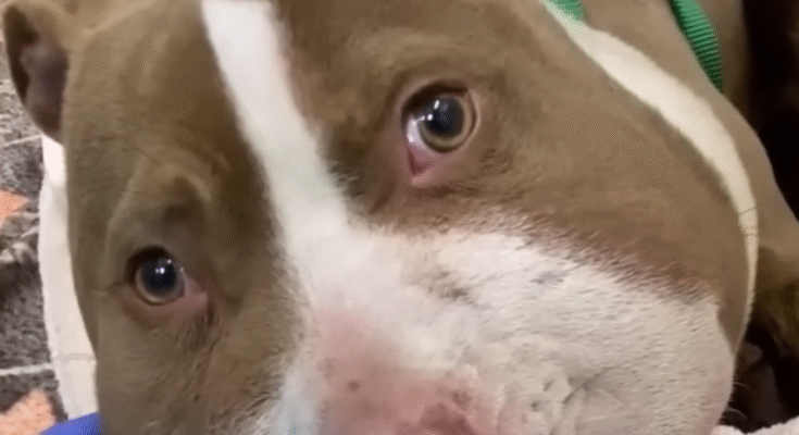 On her doorstep stood a dog — or what was left of one. Her fur was matted with dirt and blood, her eyes wide and glassy with pain. She was trembling so hard her legs barely held her up. She wasn’t barking or whining; she couldn’t. Around her neck was a thick rope, tightly wound and cutting deep into her skin. It had been there so long it had begun to fuse into her flesh, leaving a raw, festering wound.