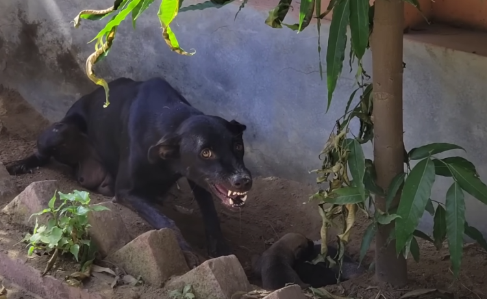 Maya growled, low and guttural, her hackles raised. Her teeth bared, she lunged forward, snapping in warning. The cats hissed, backing away, not used to such fearless defense from a lone, thin dog. Maya didn’t stop. She paced around her puppies, snarling, snapping, making sure no one dared approach. Her body was tense, every muscle coiled, ready to strike at the slightest threat.