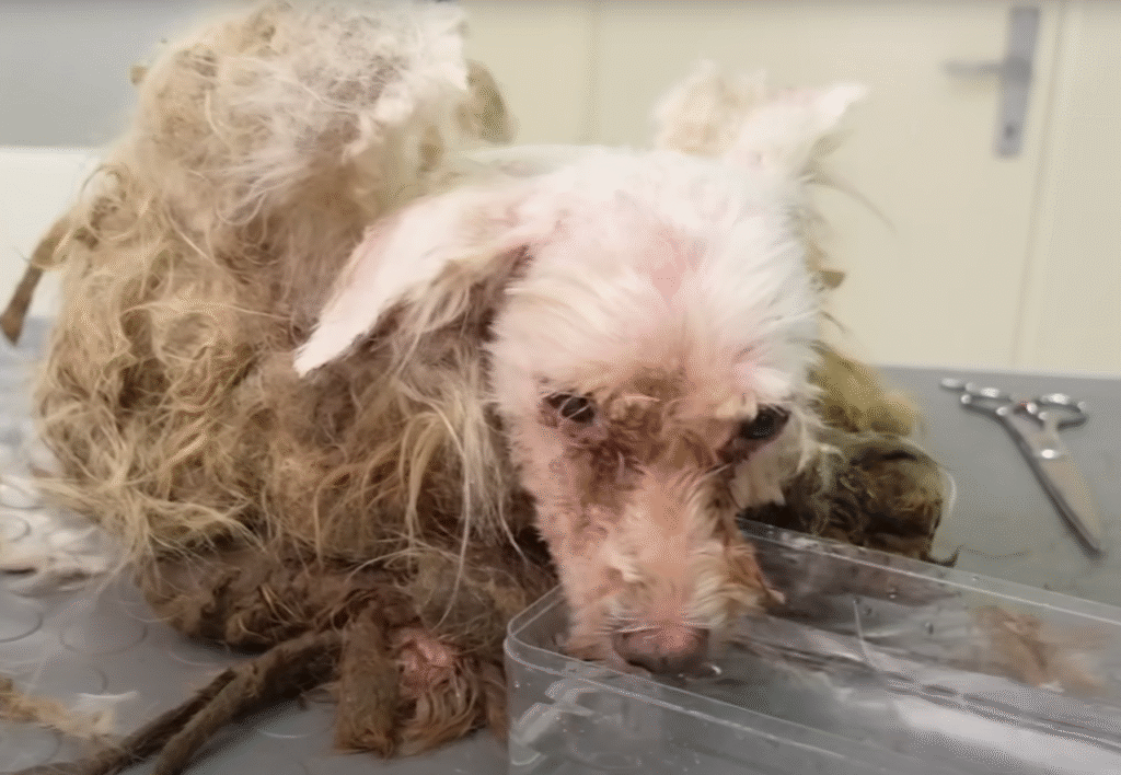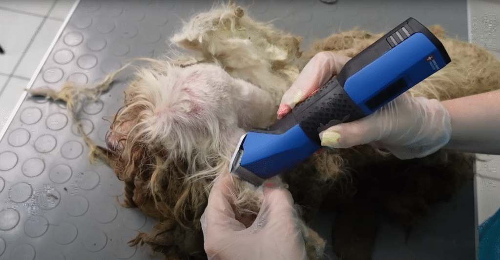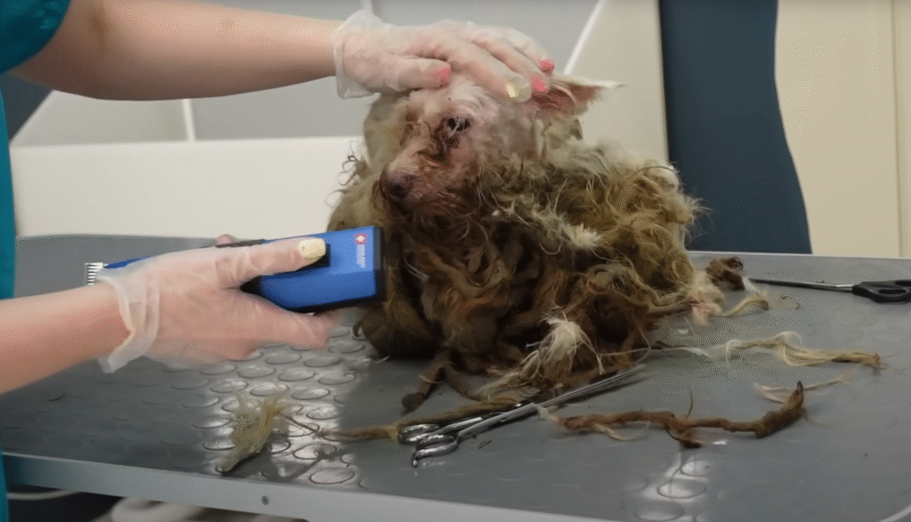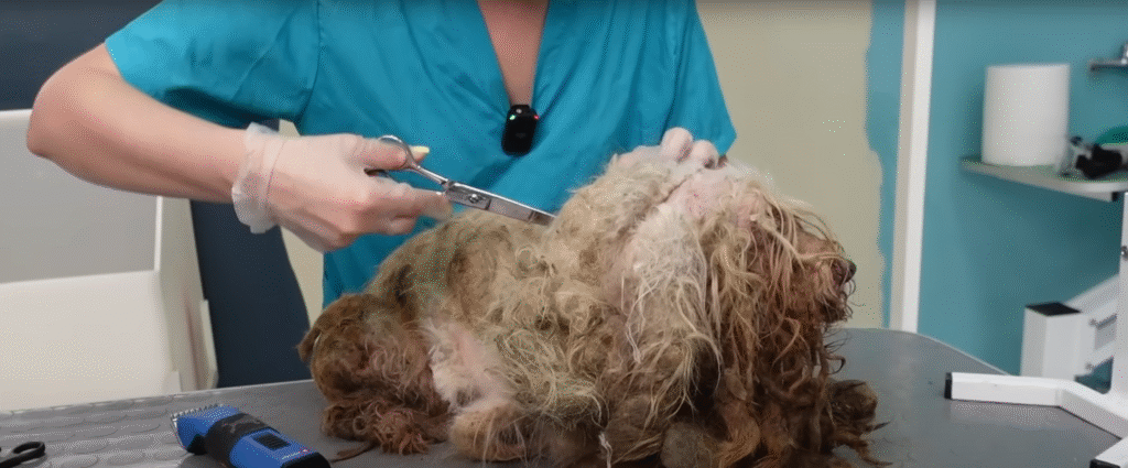 We couldn’t even begin with a brush—it was useless. Instead, we carefully used scissors and clippers to start removing the thick mats layer by layer. Every snip revealed a new patch of skin, often red and irritated, sometimes even bleeding slightly from the tension of the hair being pulled for so long.