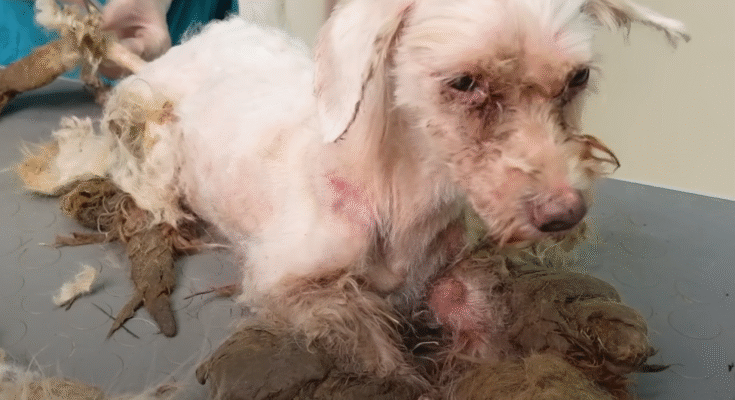 The creature before me was completely unrecognizable—just a moving mass of filthy, matted fur. His coat was so overgrown and knotted that I couldn’t tell where his legs began or ended. He moved stiffly, hobbling rather than walking, every step a visible struggle. His smell hit me next—an overwhelming, rancid odor that filled the room with a mix of rot, urine, and old dirt. I had groomed neglected dogs before, but this was different.