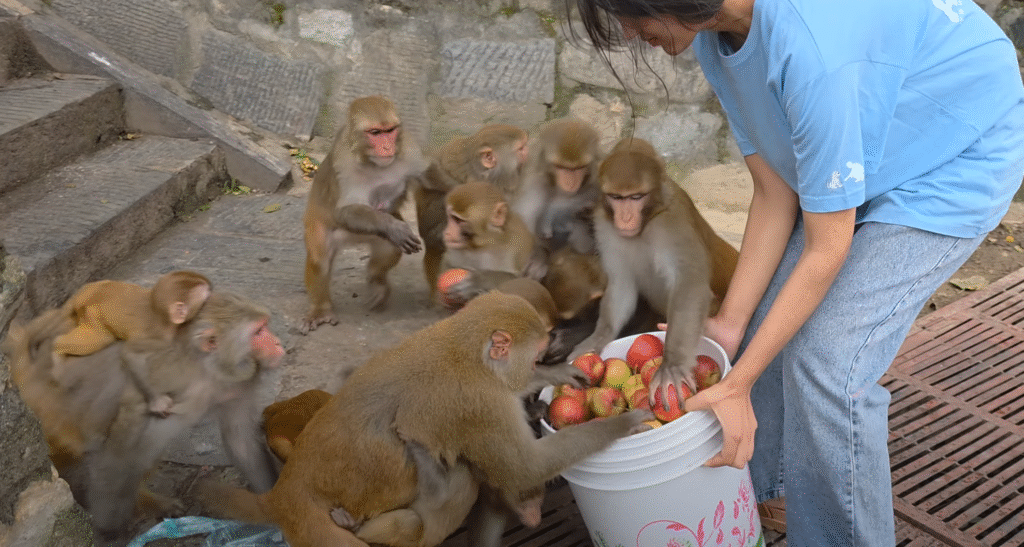 Deep in the caretaker’s hut, a young volunteer named Lina was busy preparing something special. She had spent the last hour washing a mountain of apples and peeling dozens of bananas. The air was filled with their sweet scent, and even from afar, the monkeys could smell the delicious promise of the day. Lina smiled as she filled a big blue bucket with the juicy fruits, knowing how much the monkeys adored them.