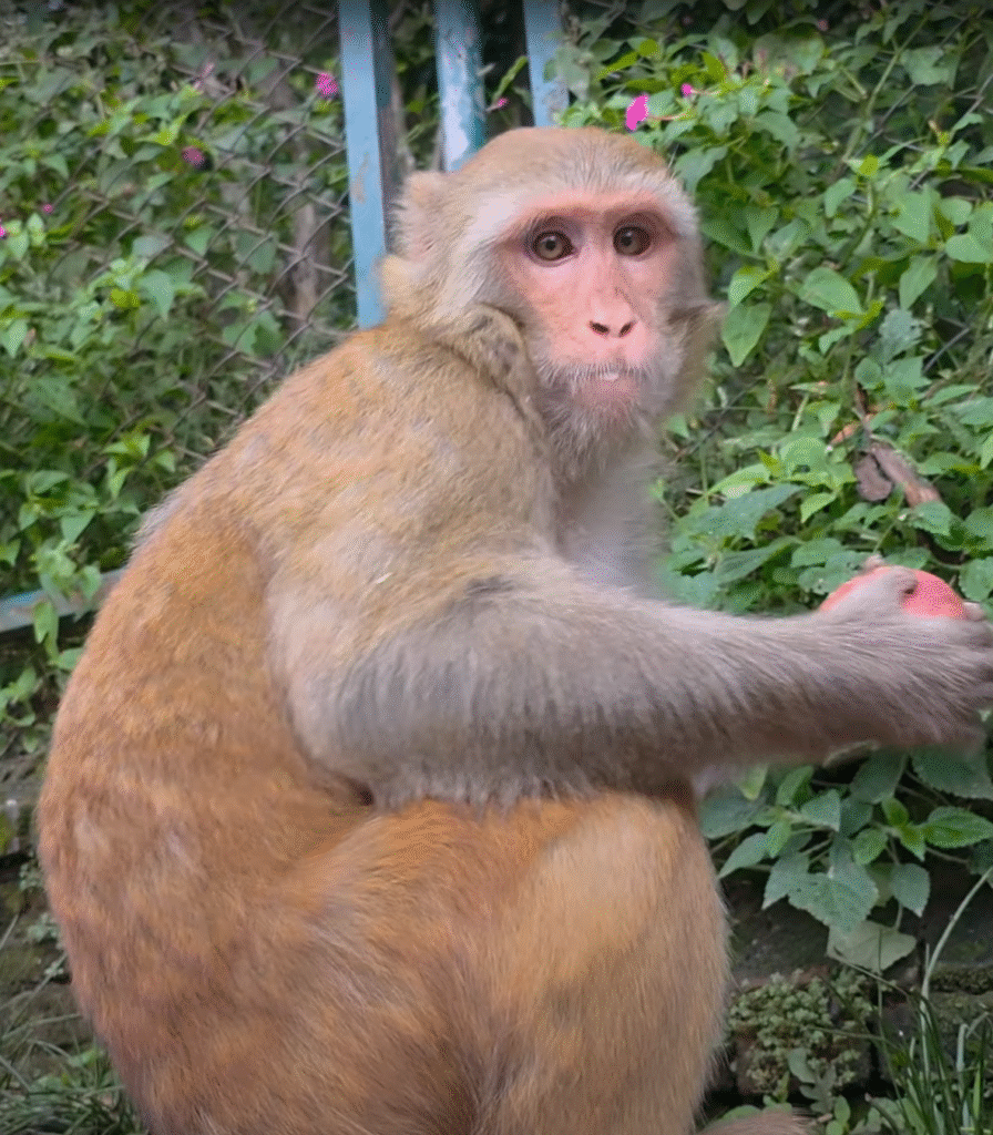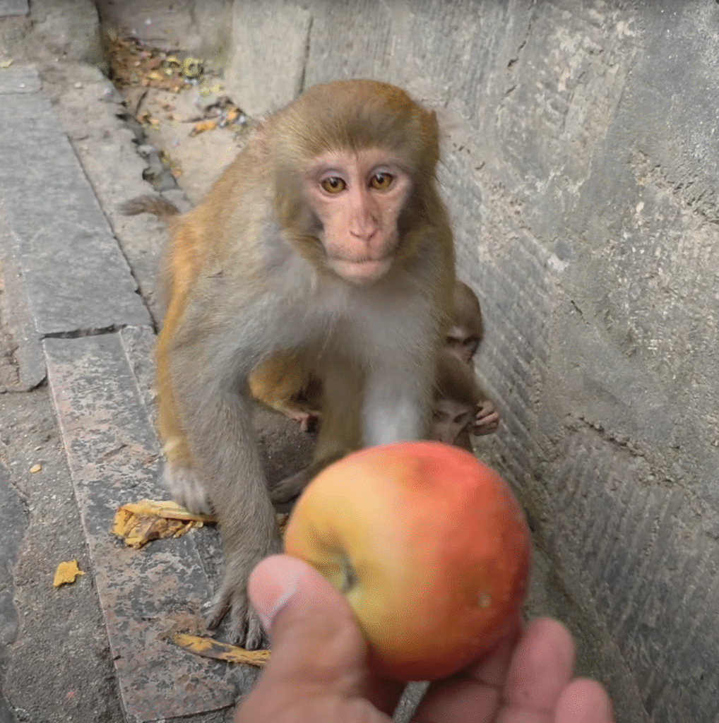 Some monkeys preferred the apples, tossing them into the air before catching them again just for fun. Others went straight for the bananas, savoring the sweetness as they sat on the rocks or hung upside down from branches. The younger monkeys played tug-of-war with apple slices, while a few of the older ones watched from above, content to see the joy spreading through the troop.