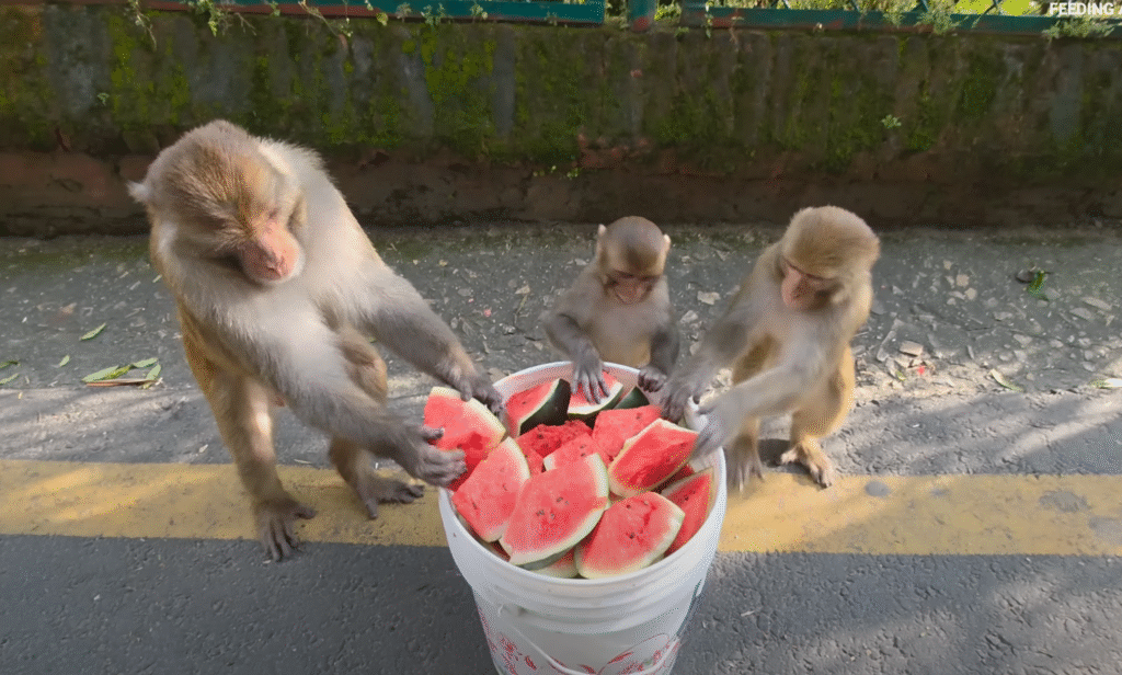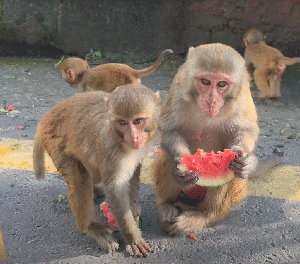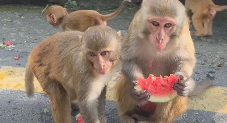 Momo, always the leader, decided to organize things in his own playful way. He picked up a watermelon rind and placed it in front of him like a dish, then invited two younger monkeys to share it. They sat together, munching in perfect harmony, tails brushing against each other. It was a small but touching sight—a reminder of how strong their bonds had become.