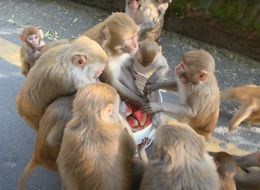 The monkeys swarmed around the baskets, each grabbing a piece of fruit. Some snatched bananas, while others reached for watermelon slices that glistened in the sunlight. The moment the first bite of watermelon touched their tongues, their expressions changed from curiosity to pure delight. The juicy sweetness was unlike anything else—they loved it.