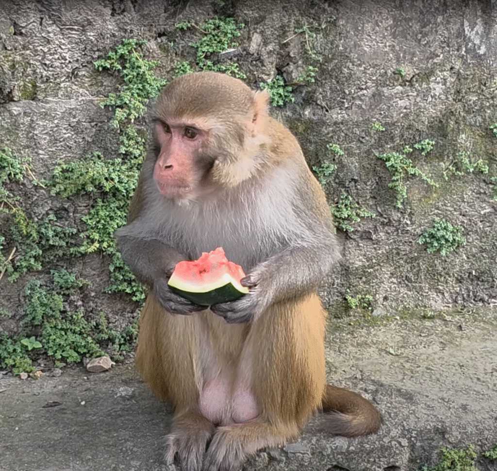 The air was filled with sounds of joy—chattering, giggling, crunching, and the soft splashes of watermelon juice hitting the grass. A few monkeys got creative, squeezing the watermelon slices just to see the juice drip, then licking it off their fingers. Others used the rinds like little bowls, filling them with banana pieces as if they were making their own fruit salad.