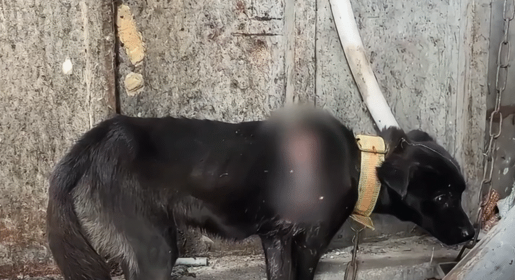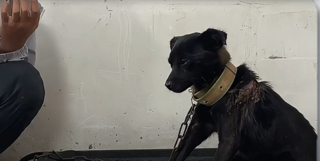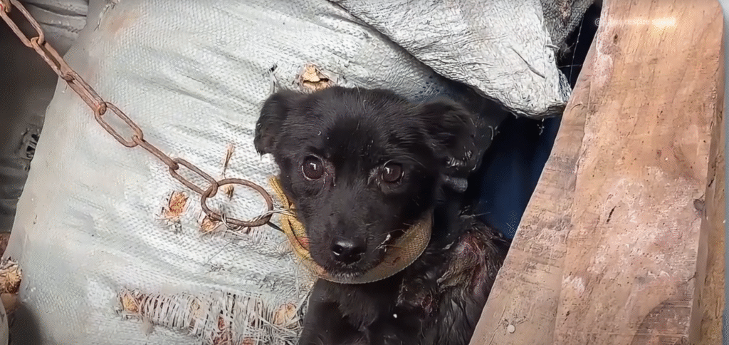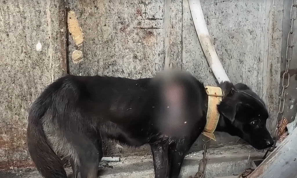 The afternoon sun burned hot against the cracked earth, and the air smelled of rust and dust. In a forgotten corner behind an old wooden house, a young dog lay still — his body thin, his fur dull and matted, and a heavy chain wrapped cruelly around his neck. The chain clinked softly every time he tried to move, a sound that once meant freedom but now marked his suffering.