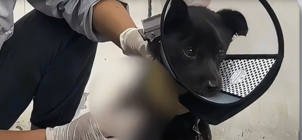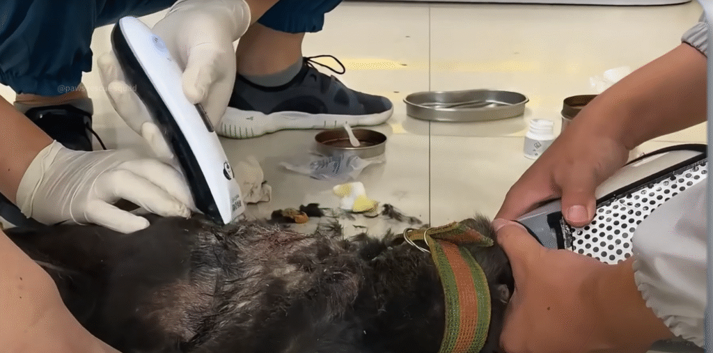 She removed the chain gently, freeing him at last. The collar left a deep wound around his neck — the mark of neglect, of pain, of love betrayed.