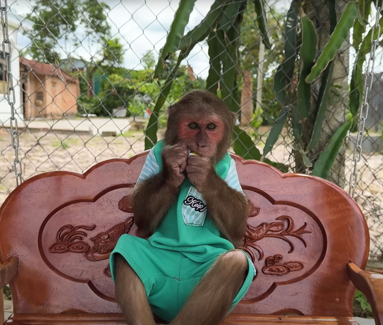 Then came the funniest moment of all. CUTIS, inspired by the shiny objects, decided he wanted to decorate himself too. He took one of the coins, pressed it against his forehead like a royal gem, and strutted proudly in front of his mother. The baby monkey, still wearing the tangled beads, followed behind him, mimicking his movements.