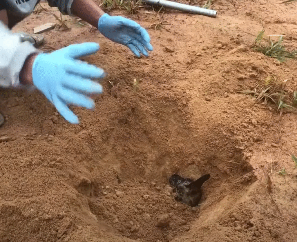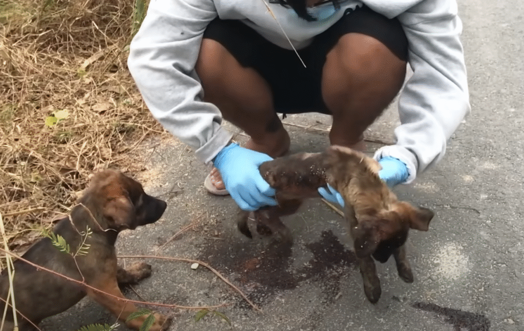 “Oh, you poor babies…” she whispered, kneeling down. The uninjured dog looked up at her with pleading eyes, his little paws still together, as if begging her to understand.