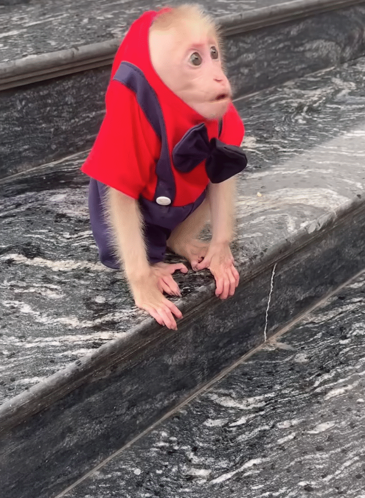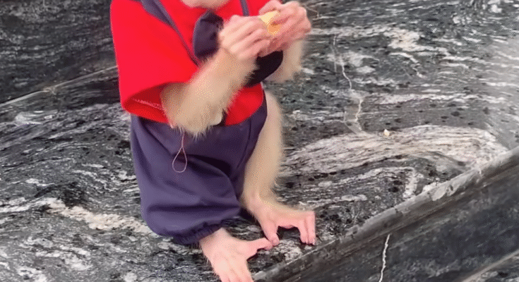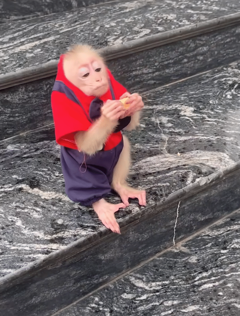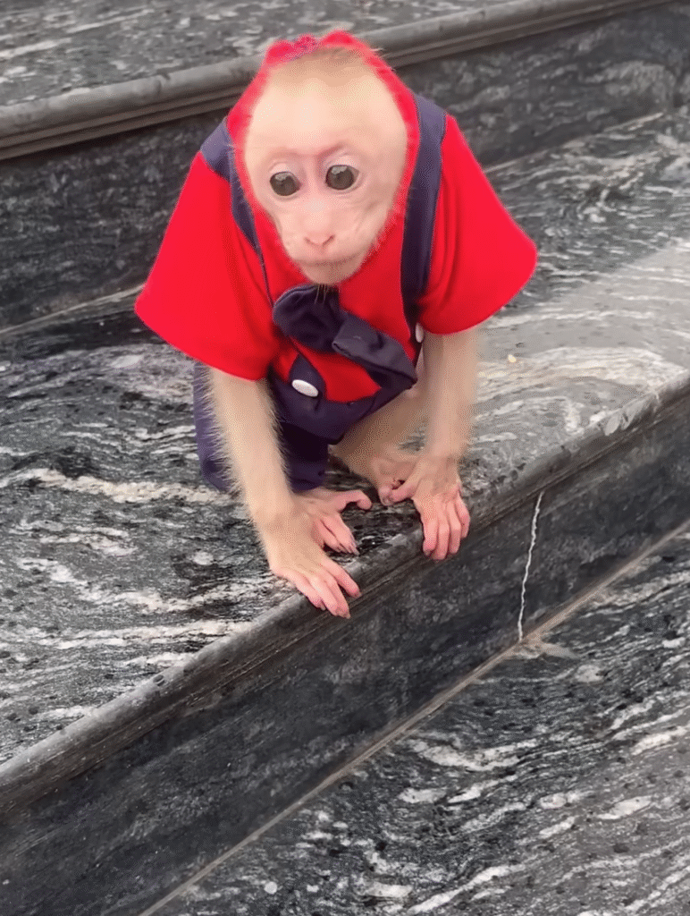 One day, a group of tourists came to visit the village. They had heard about the “cute little monkey” who could do tricks. Mimi wasn’t shy at all. She ran straight up to them, tugging at their pant legs, inviting them to play. The visitors were delighted! They gave her small fruits, took pictures, and laughed as Mimi posed like a little model — tilting her head, clapping her hands, and even pretending to smile for the camera.