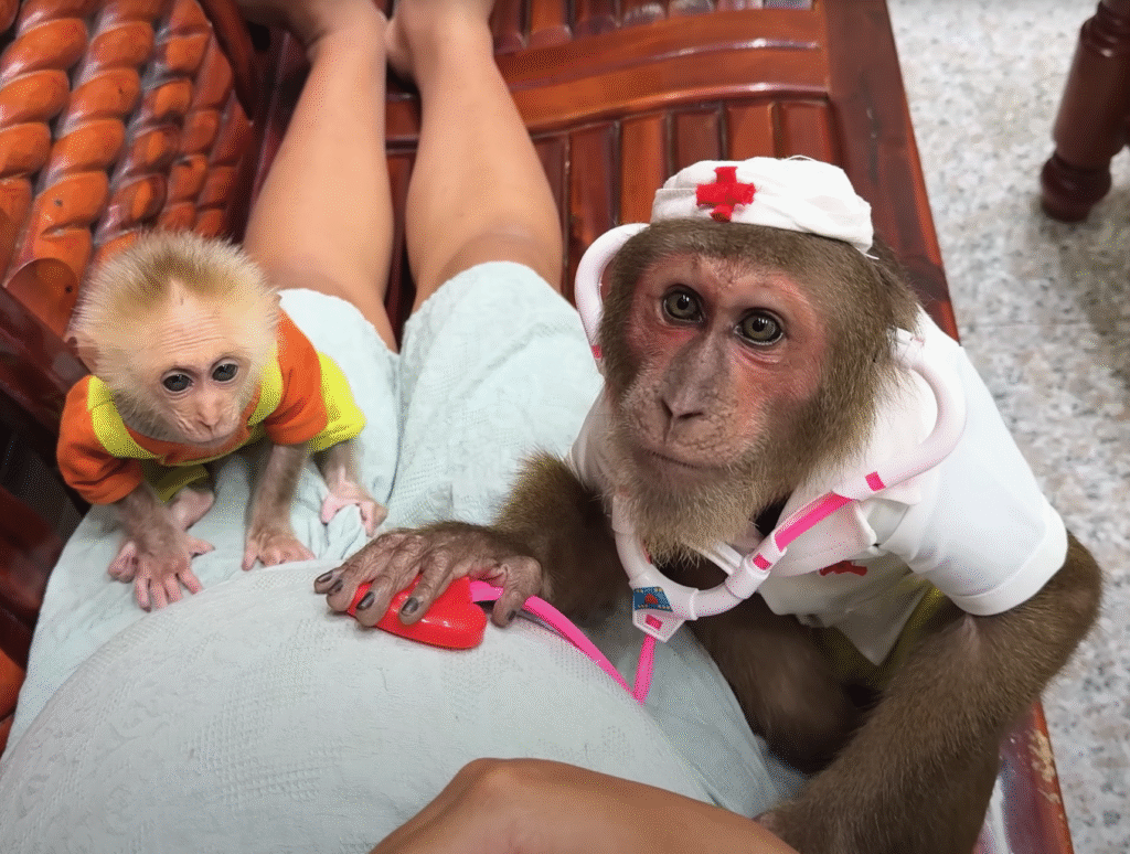 Baby monkey blinked, confused. “You’re not a real doctor,” he said in a small voice. “Doctors wear shiny glasses and use cold things on your chest.”