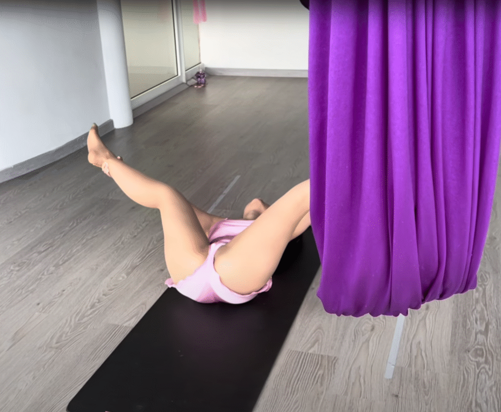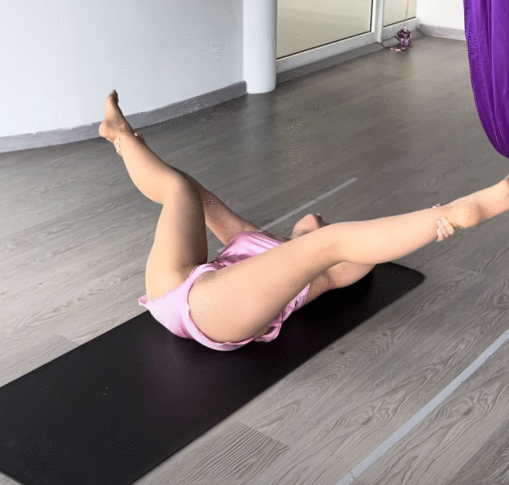 Next came gentle leg swings. Olesya stood tall, holding onto the wall for balance, swinging one leg forward and backward, then side to side. “This increases blood flow and prepares your hips,” she explained. Her movements were fluid, perfectly balanced, every swing controlled yet relaxed.
