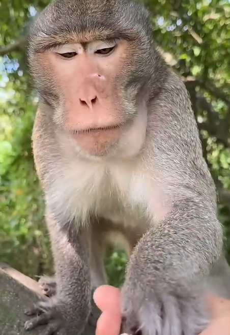 Breakfast time is serious business — especially when bananas are involved. The caregiver arrives with a big basket filled with ripe bananas, and all the monkeys’ eyes light up instantly. You can almost hear them thinking: “Those are mine!”