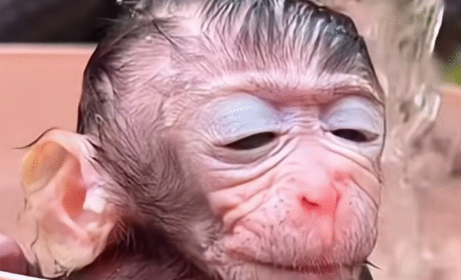 When the sun peeked through the soft morning clouds, a tiny orphan baby monkey named Lili was about to experience something completely new — her very first bath. Her little eyes sparkled with curiosity and fear all at once. She had never seen a tub filled with warm water before, and she didn’t quite understand what was about to happen. Her small hands clutched her blanket tightly, her heartbeat quickened, and her tail curled around her body for comfort.