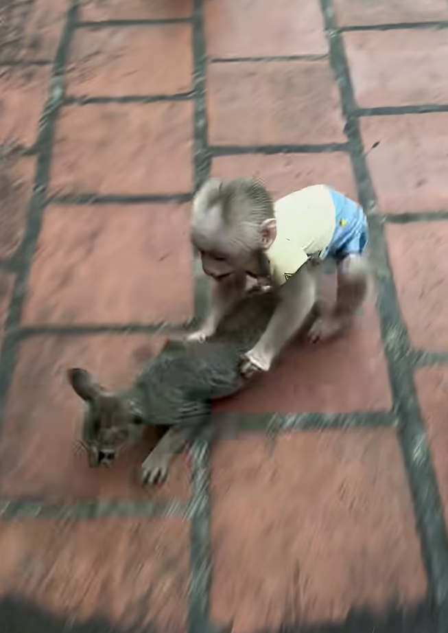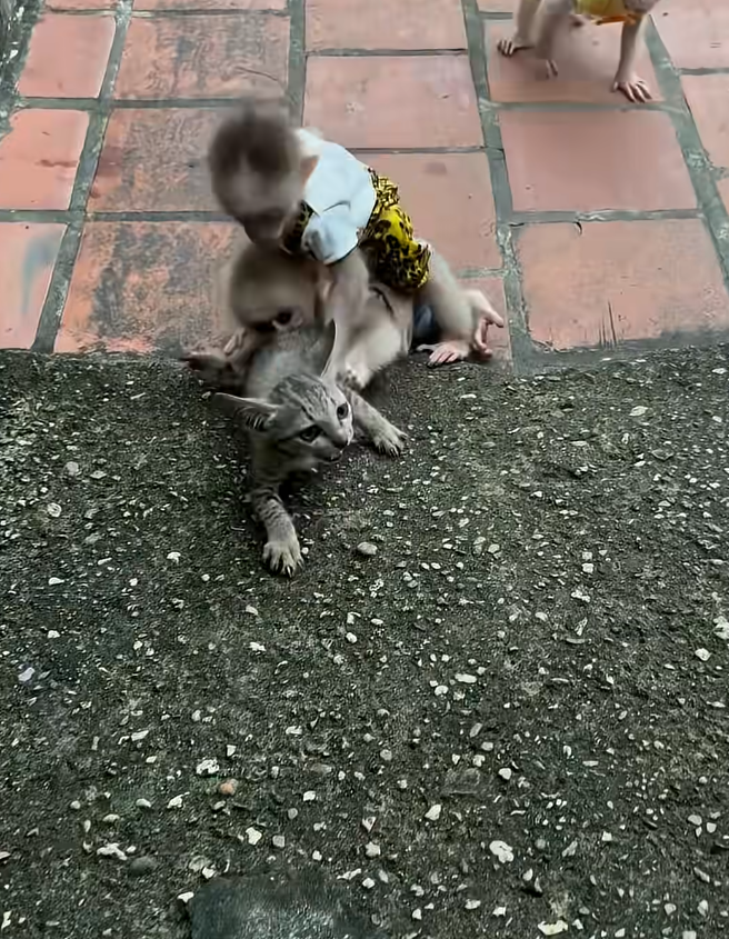 Finally, the kitten stopped near the fence and turned around. Its blue eyes blinked curiously at the two monkeys. It didn’t look scared anymore — just a little surprised. Kevin stopped a few steps away, breathing hard. Kimi caught up, her tail swinging excitedly.