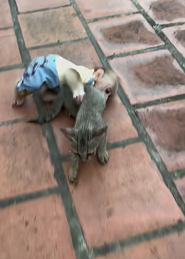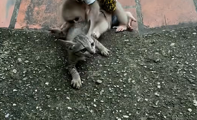 They spent a long time in the yard, playing together. The kitten would chase Kimi’s tail, and Kevin would gently roll a small ball for it to pounce on. They ran in circles, climbed small rocks, and even shared some of Kimi’s banana pieces with the kitten — though the kitten mostly sniffed them and walked away.