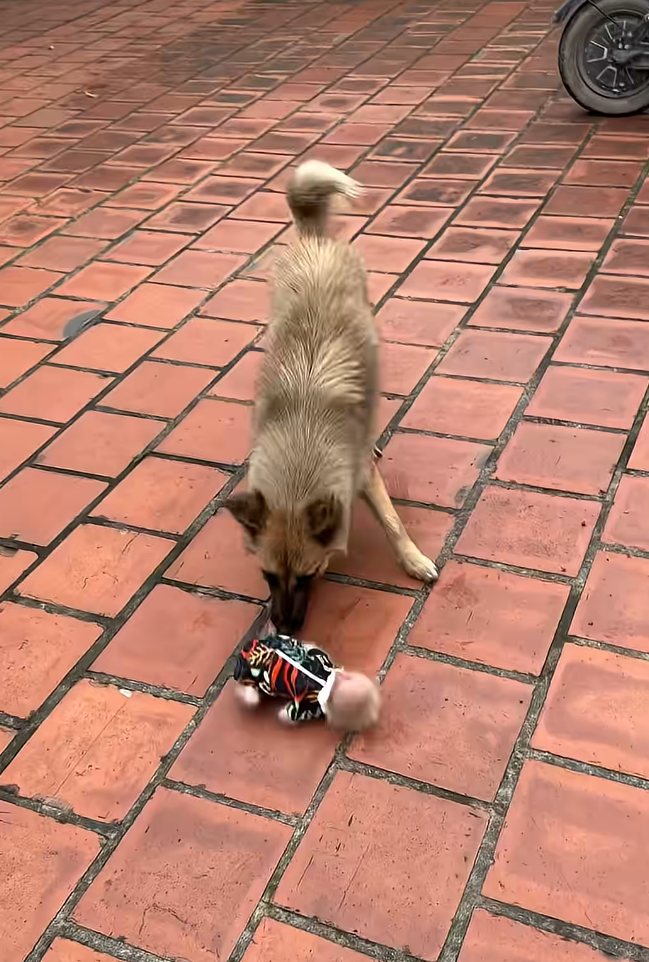 When Lucky didn’t move, she reached for the stick curiously. She sniffed it, then gave him a playful tap on the head with it.