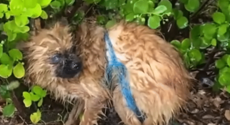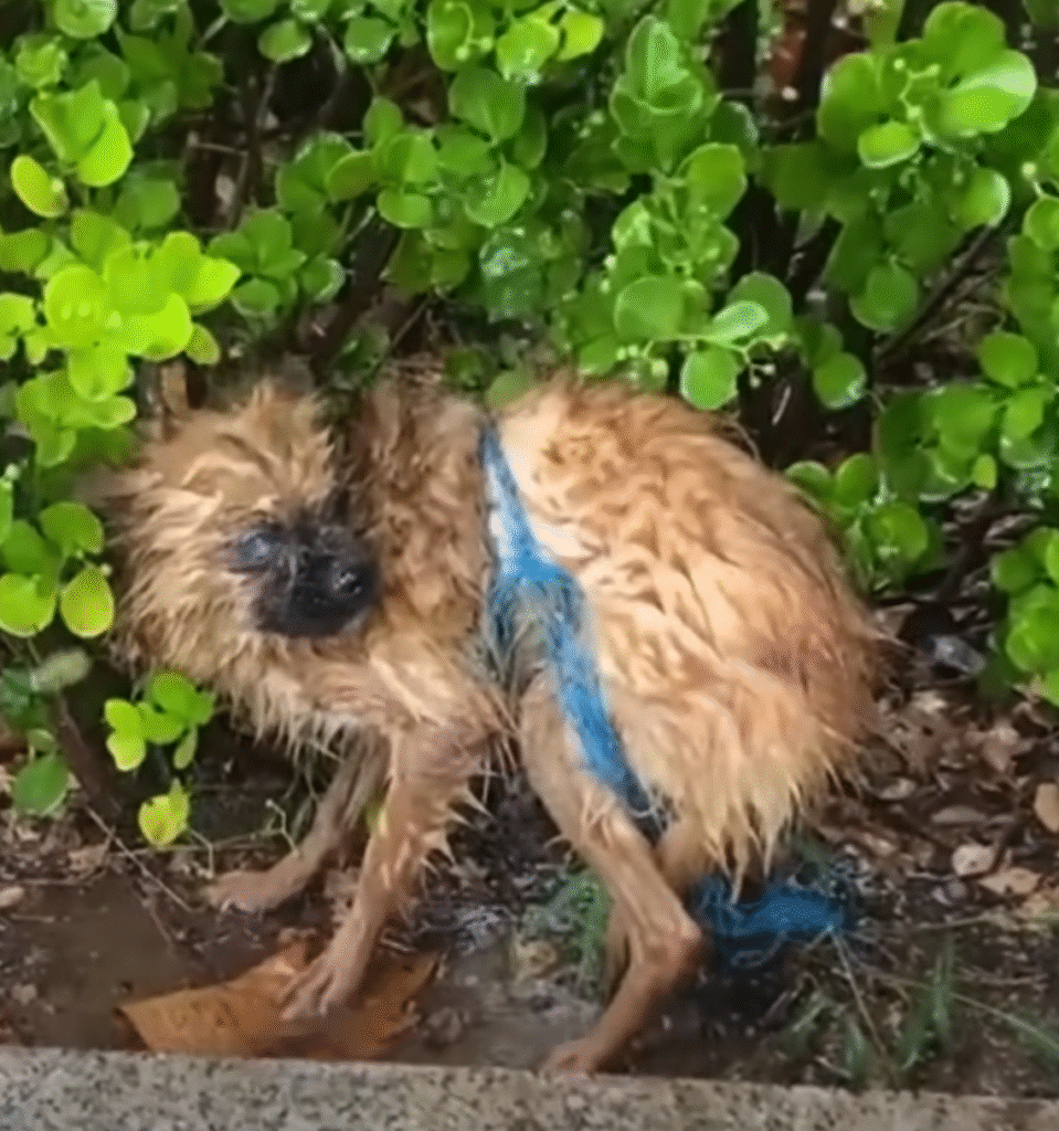 She was a dog—thin, soaked to the bone, her fur matted with dirt and rainwater. One of her eyes was swollen shut, the other wide with fear and exhaustion. Every step she took seemed to cost her enormous effort. Her paws sank into the cold mud as she crawled forward, searching for something—anything—that could keep her alive.