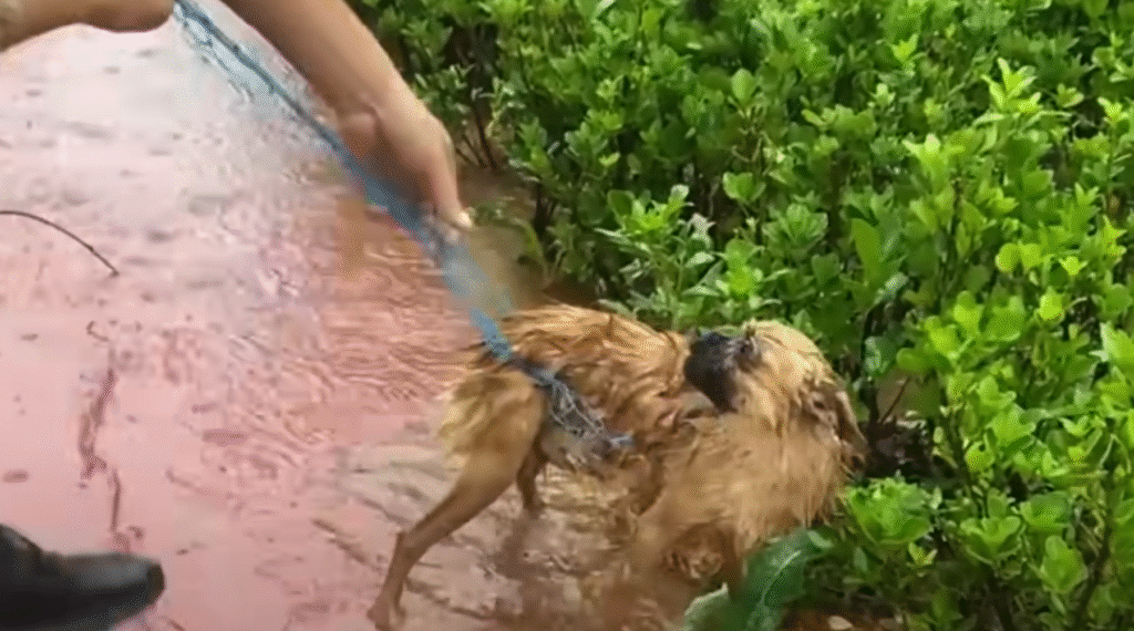 Laura set the flashlight aside and slowly extended her hand, letting the dog smell her fingers. The little one trembled, uncertain, but too weak to run. When Laura gently touched her soaked fur, she felt the dog’s ribs—so sharp and fragile it felt like touching twigs under thin fabric.