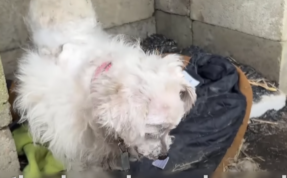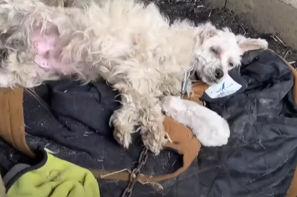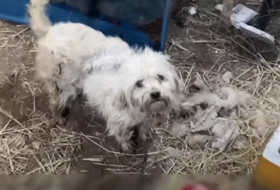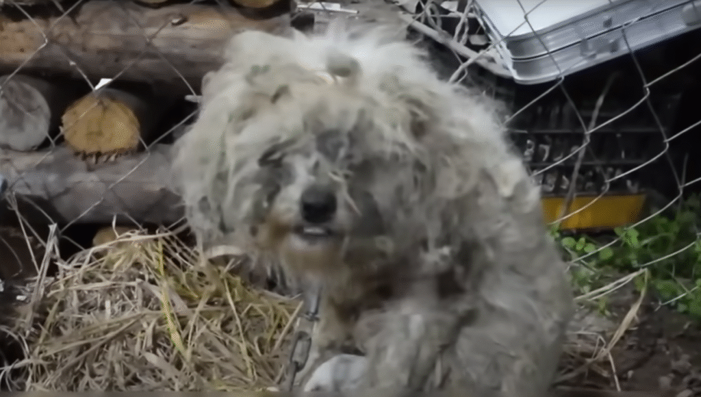 In a small, forgotten corner behind a crumbling wooden shed, a rusted chain rattled softly with every weak movement. The air smelled of dust, rain, and old metal. There, lying on the cold, damp ground, was a mother dog—her body frail, her fur matted, and her eyes dull with exhaustion. Around her, five tiny puppies squirmed blindly, pressing against her belly, searching for warmth and milk that she no longer had to give.