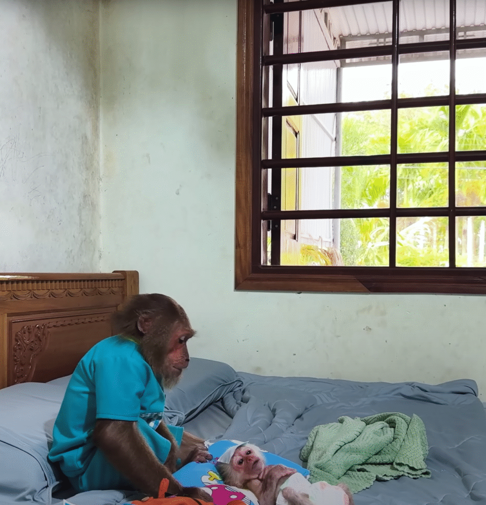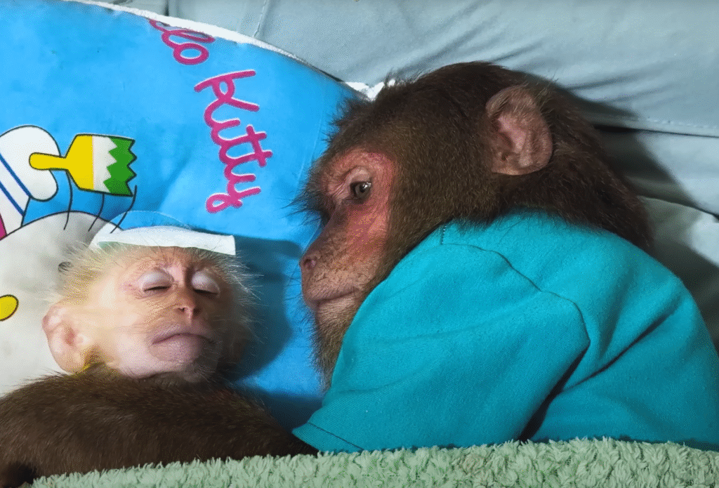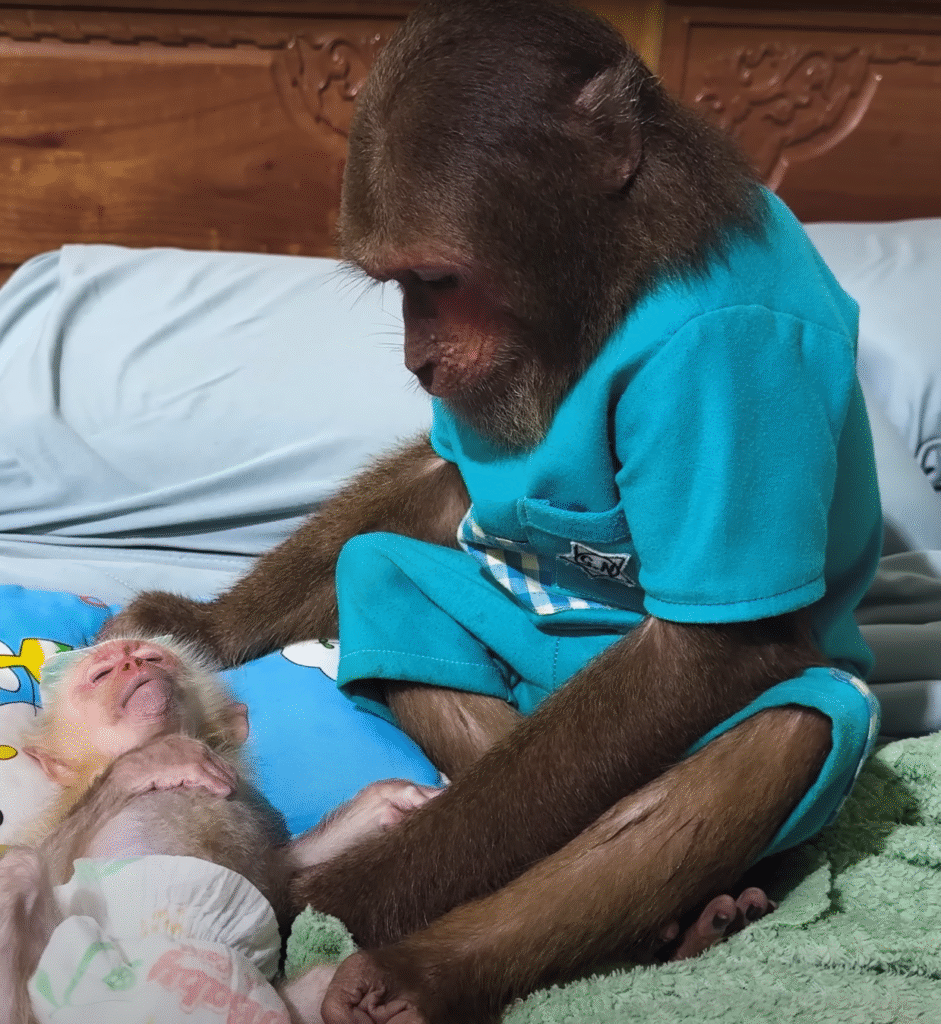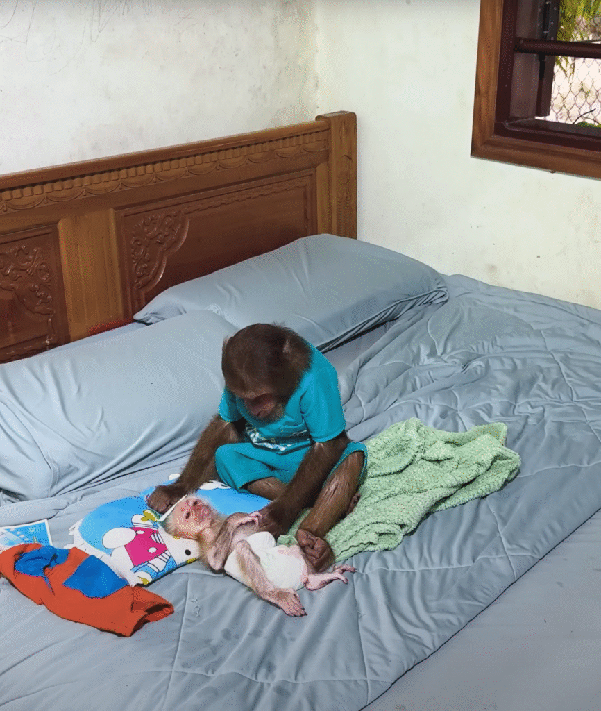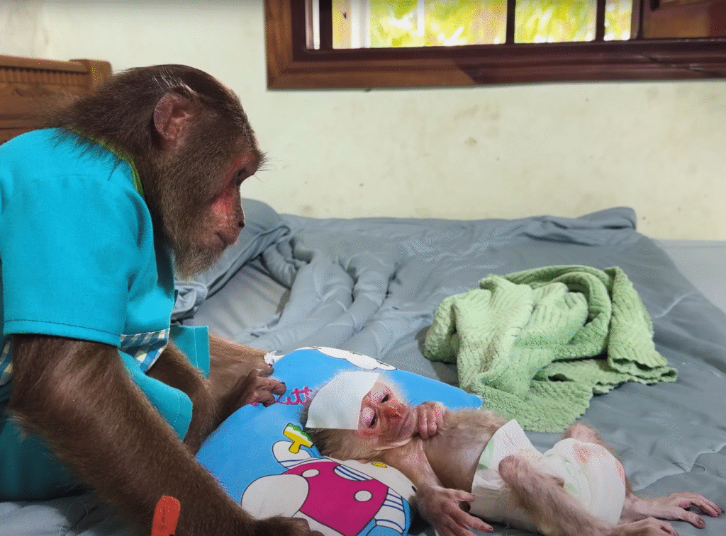 After a while, Lilo’s breathing became steadier. He began to relax and even cling to CUTIS’s arm again. CUTIS smiled — yes, smiled in that cheeky monkey way — as if to say, “You’ll be okay, little buddy.” He decided not to leave Lilo’s side, even for food. He stayed beside him all afternoon, chasing away flies and covering the baby when the sun grew hot.