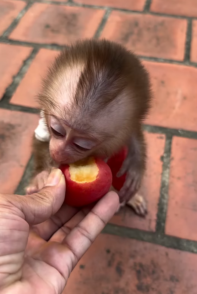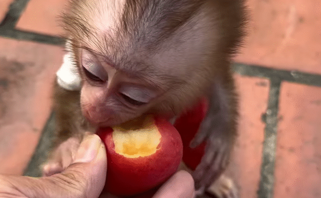 The warm morning sun filtered gently through the trees, lighting up the small yard where Baby Monkey Bon was playing. His tiny golden fur glowed under the sunlight, and his curious eyes scanned everything around him — a few fallen leaves, a half-empty water bowl, and a basket of fruit sitting on the wooden table near the hut. The moment his little nose caught the sweet scent of ripe bananas, Bon’s tummy gave a tiny growl. He loved bananas more than anything in the world — soft, sweet, and easy to chew.