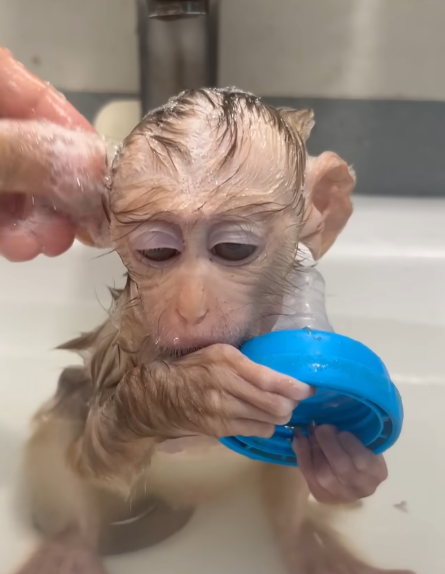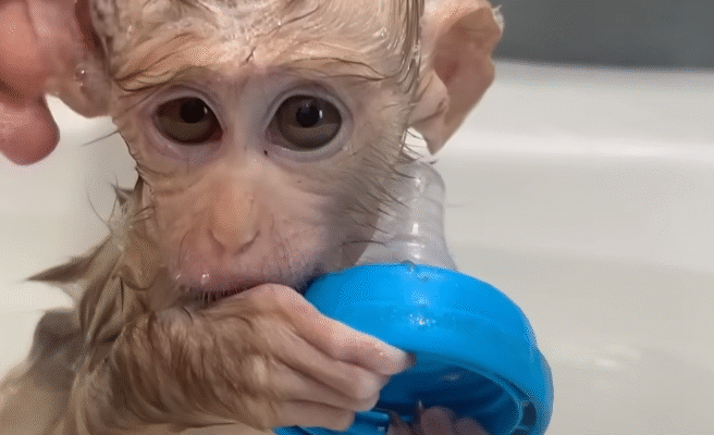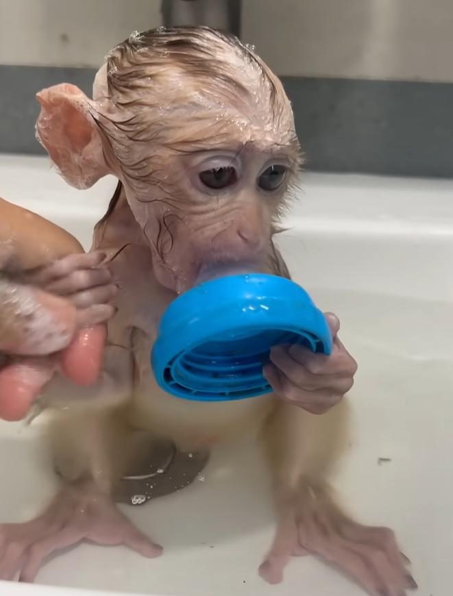 The baby monkey blinked, then reached out to touch the bubbles forming in the tub. Her tiny fingers tried to grab them, but they popped instantly, making her giggle. Mom couldn’t help laughing too — that sound of pure joy always melted her heart.