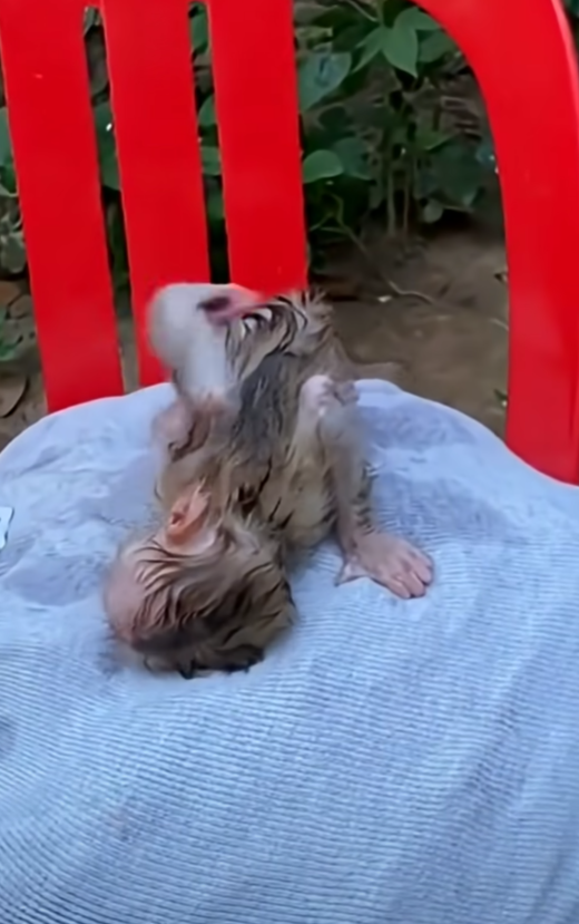 After rinsing off the bubbles, Cutis lifted Bon gently from the water, wrapping him in a soft, fluffy towel. The baby monkey burrowed into the warmth immediately, making soft cooing sounds. His fur was damp and spiky, his little face peeking out from the folds of the towel like a baby wrapped in a blanket.