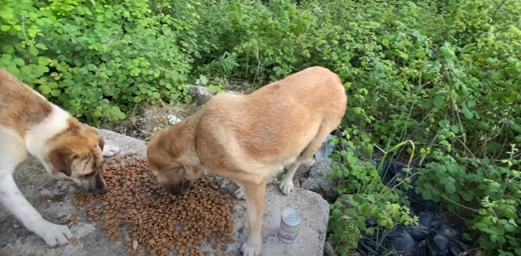 Hours passed. The road was quiet except for the wind rustling through the trees. Then, from a distance, we saw movement — a thin dog, her ribs showing, creeping toward the food.