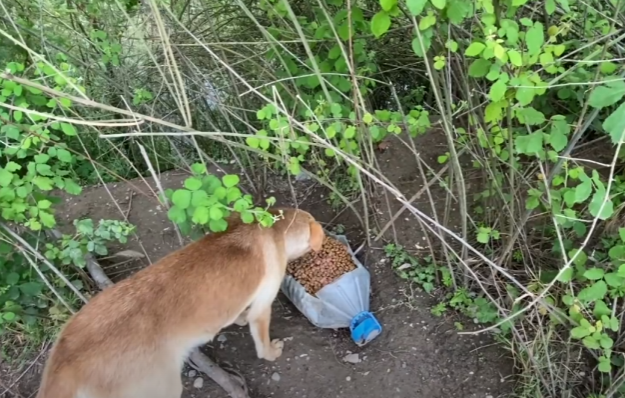 The next morning, we returned to the same area with some food and water, hoping she might still be searching for her babies. We placed bowls near the bushes and waited.