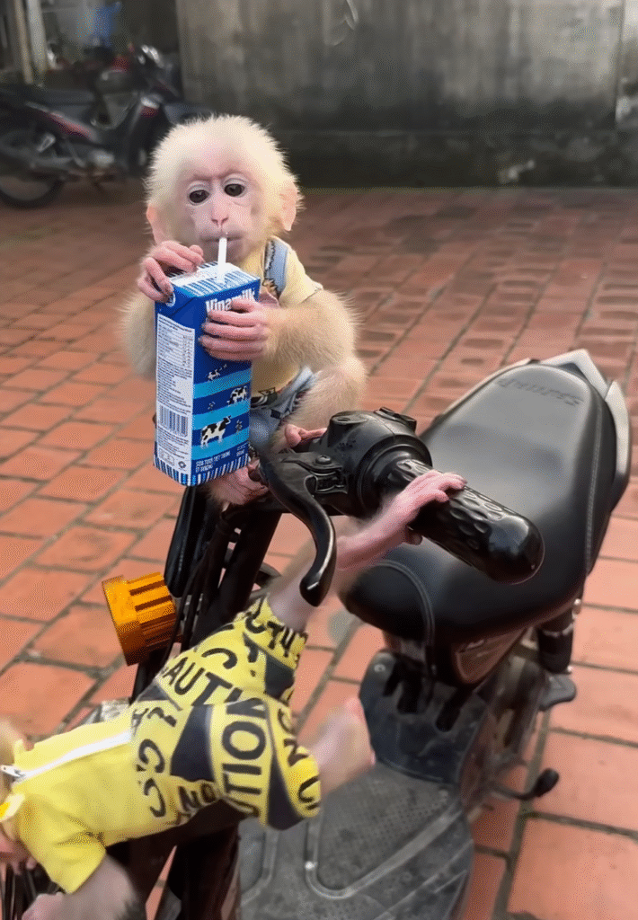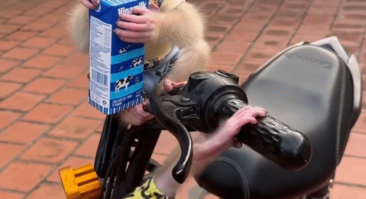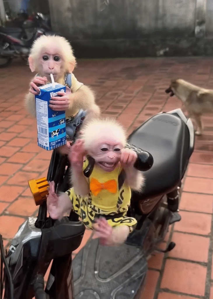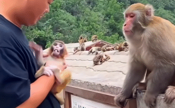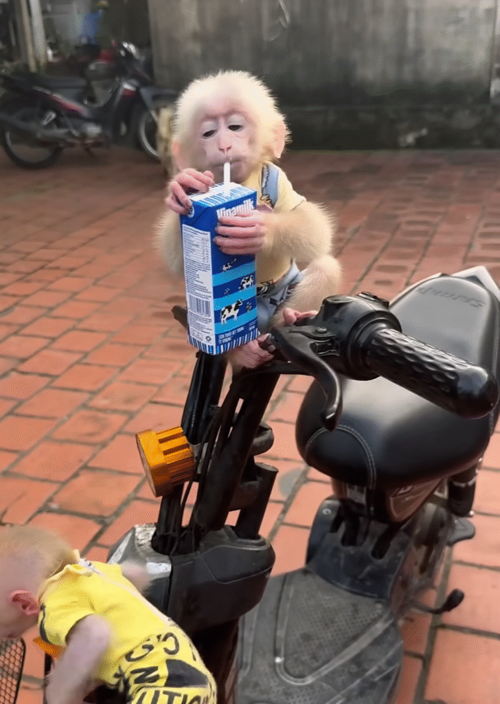 Her tiny home was always full of laughter, warmth, and a few mischievous squeals from her furry family — especially from Bon, the baby monkey who had been with her since he was just a few days old. Bon adored Mommy Cute more than anything. Wherever she went, Bon followed — whether she was sweeping the yard, cooking lunch, or hanging clothes to dry, there was Bon, clinging to her leg or shoulder, eyes wide with devotion.