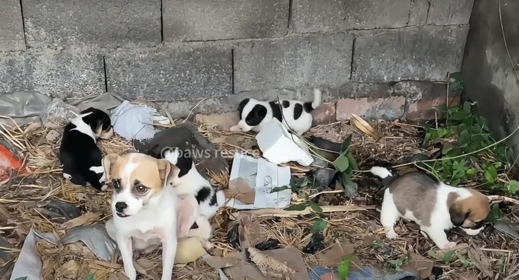 The sun had barely risen over the outskirts of the small town when a weak, almost imperceptible whimper broke the morning silence. It came from behind an abandoned shed at the edge of a dusty road — a place most people passed without a second glance. There, hidden beneath a pile of rotting boards and overgrown weeds, lay a heartbreaking sight: a mother dog, emaciated and trembling, curled protectively around her four tiny puppies.