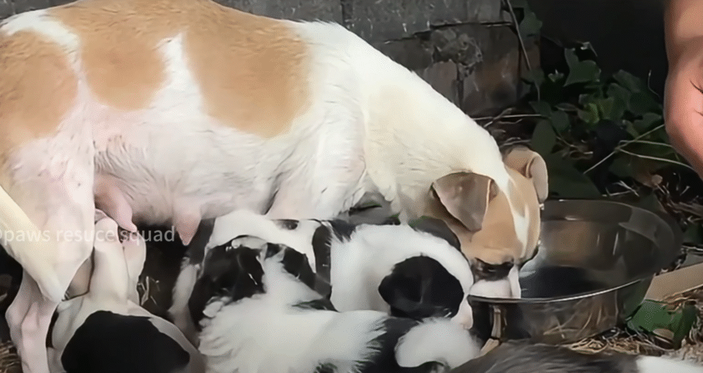 Her fur was matted with dirt, her ribs painfully visible beneath her thin skin. Every breath she took was labored, but her eyes — soft, deep, and full of exhausted love — never left her babies. Despite her frailty, she nuzzled them closer, letting them nurse even though her body had little left to give. This mother, later named Luna, had been surviving on nothing but scraps and rainwater. Yet she refused to abandon her pups. Every ounce of strength that remained in her was devoted to keeping them alive.