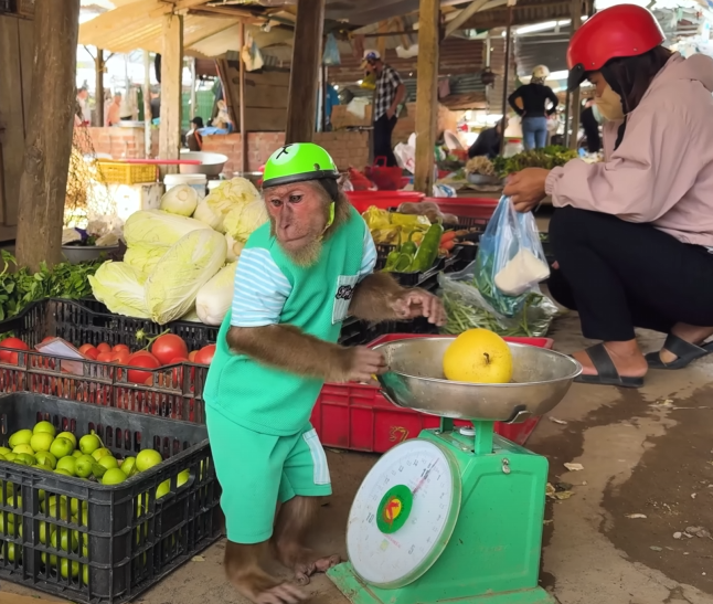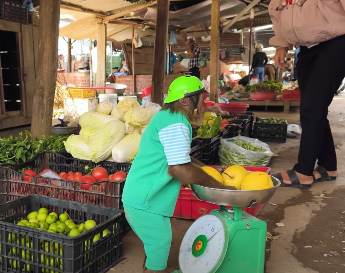 The next morning, Mom, CUTIS, and Baby monkey returned to the market. CUTIS stayed close, holding tightly to the new pouch. He was more alert this time, eyes sharp for any suspicious movement.