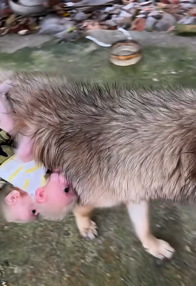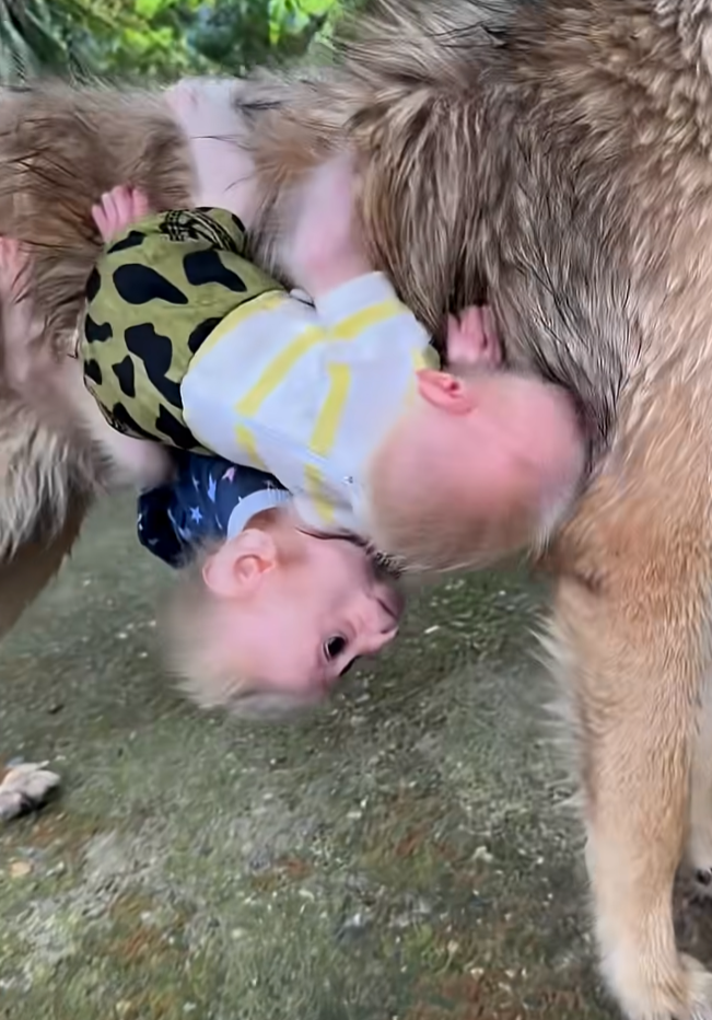 The two kids couldn’t get enough. They climbed back up, hugging the dog again and again. Lala patiently sat still, letting them cling to her like two little monkeys hanging from a tree. The moment was filled with warmth and joy — three innocent souls playing in a world that belonged only to them.