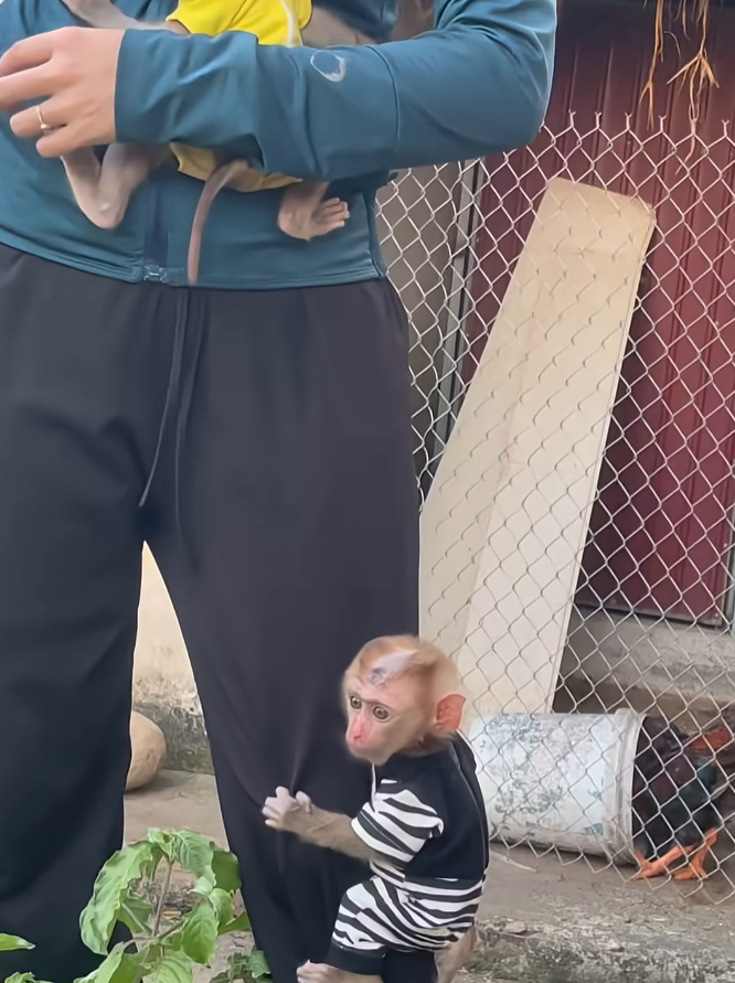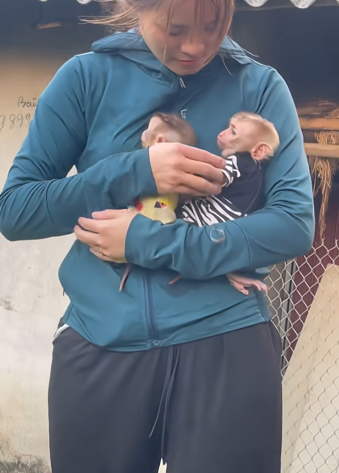 Lila stretched and yawned, signaling that it was time to begin their daily adventure. The two baby monkeys’ eyes lit up instantly. They knew what that meant — they were going out to play! Tino, the older one, jumped up and clung to his mother’s back, while Mimi, still learning to balance, stumbled after him and grabbed Lila’s tail with both hands.