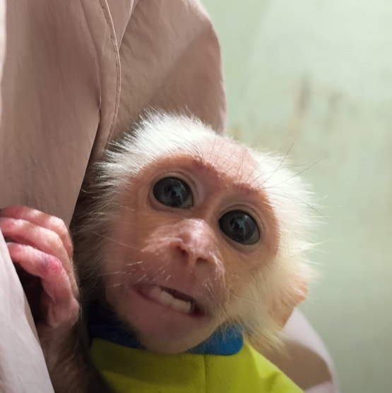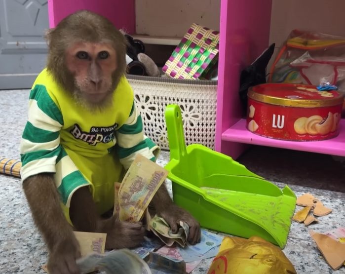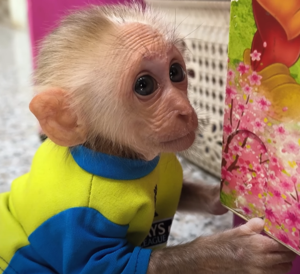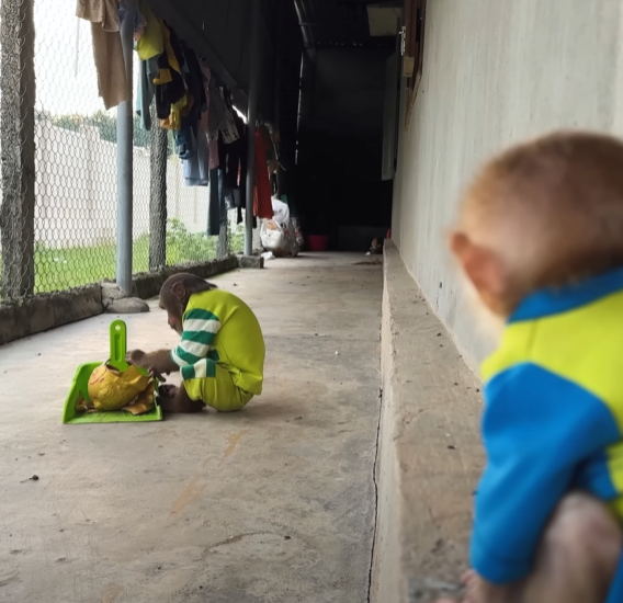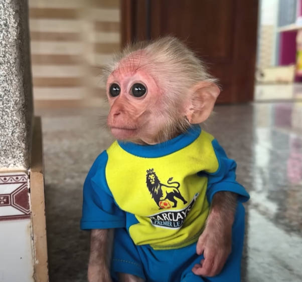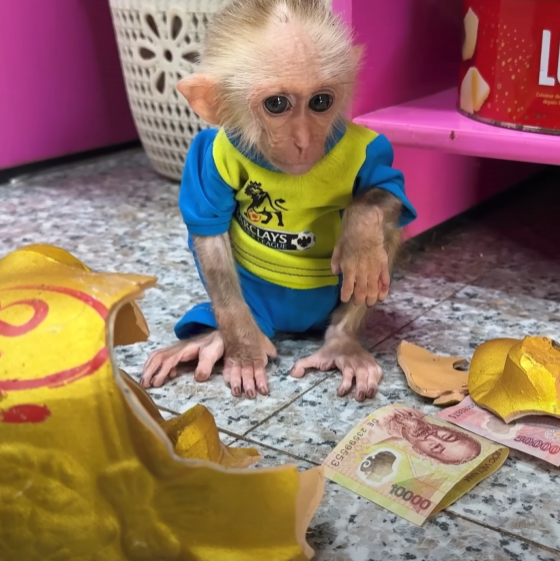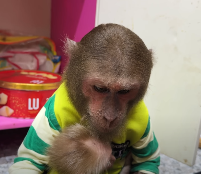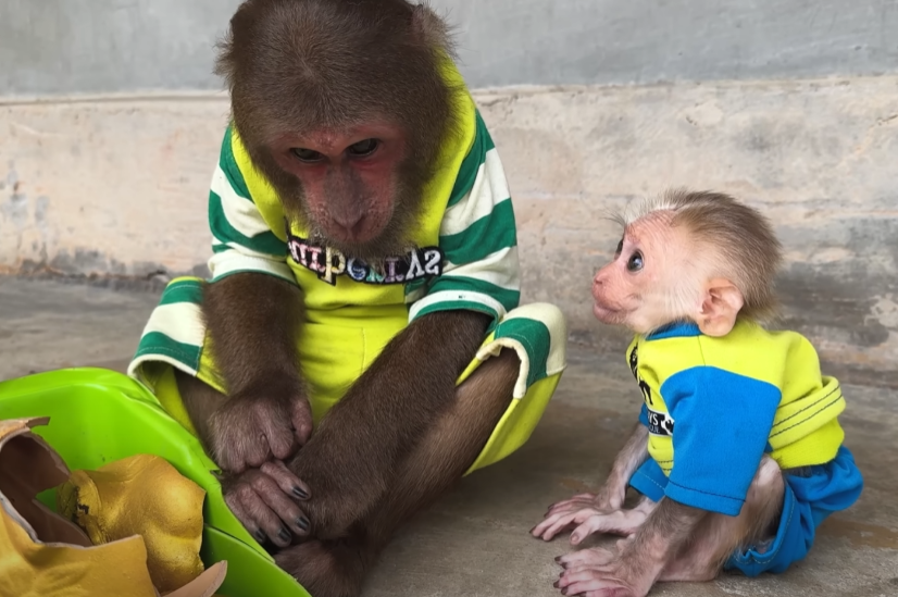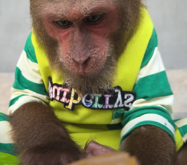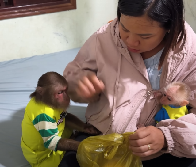 But just as he sat down to enjoy his sweet prize, the baby monkey appeared out of nowhere — with those big sparkling eyes and an innocent grin that melted everyone’s heart. The baby waddled over, holding out its tiny hands, chirping in soft, pleading sounds.